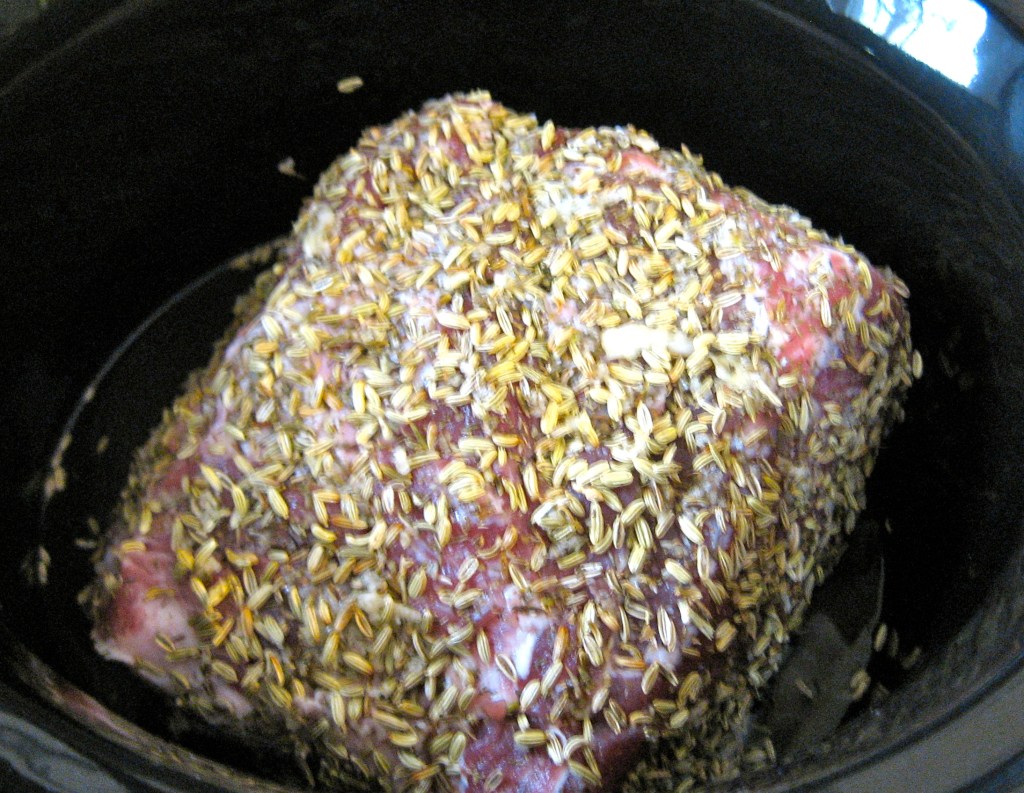 I saw this recipe in the Kansas City Star. It didn’t work so well in the oven, so I moved it to the slow cooker where its really sings to your taste buds. You may never want to eat pork roast any other way again.