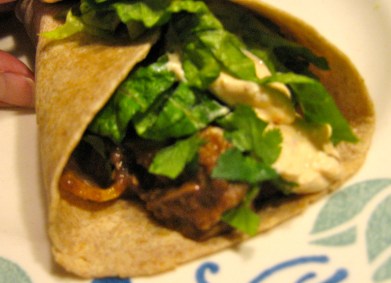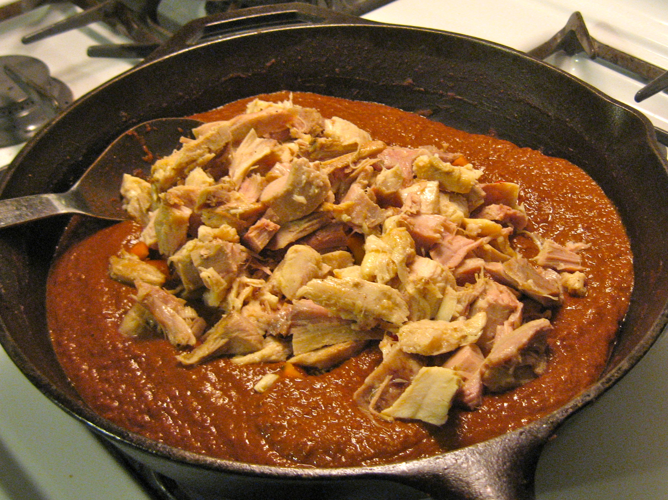 I had a BIG turkey this year for Christmas….so I had lots of turkey. We like turkey, so it was a good thing. I took all the meat and froze it and made stock from the carcass. Its been a couple of weeks now and I want turkey again. Hmmmm, its cold and I like spicy stuff when its cold. Sounds like its time for turkey mole. Mole can sometime take a while to make. This one comes together fairly quickly. Fast enough to work for a weeknight meal. You can eat this in whole wheat tortillas with your choice of toppings (as I did for this time). It is also wonderful over rice with your sauteed vegetable of choice.