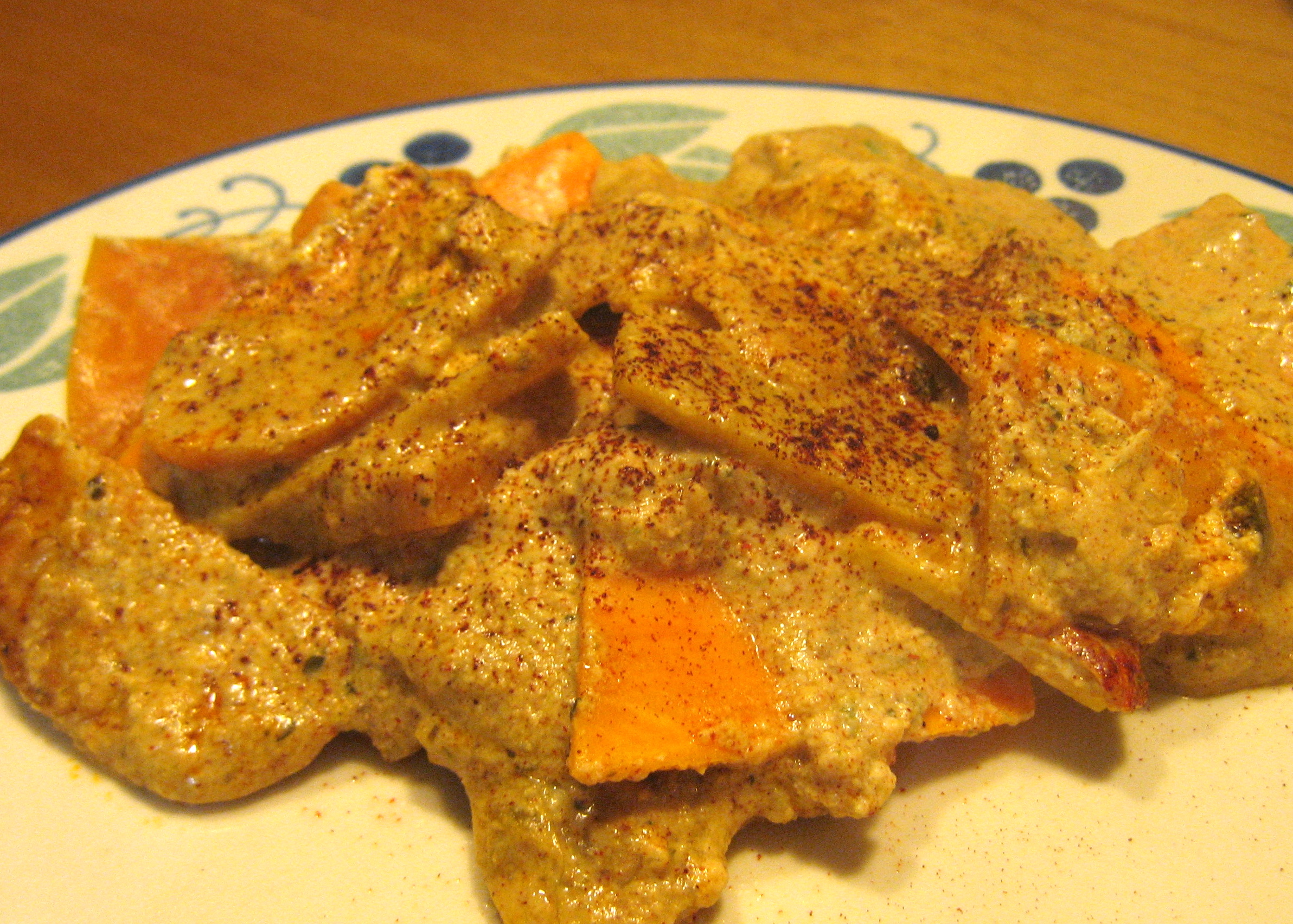 Alternate layers of sweet potatoes with yogurt sauce, ending with sauce. Cover with foil and bake for 45 minutes. Remove foil and bake an additional 15 minutes. Serve warm.