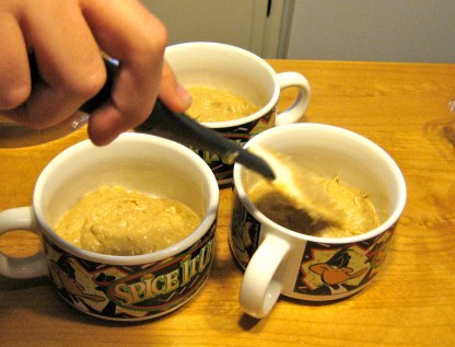 Into four greased oven proof soup mugs or similar containers, place approximately 1/2 cup batter into each dish. Sprinkle in generous portions of walnut pieces and blackberries. Add remaining portion of batter and top with more walnuts and berries. Bake for 45 minutes. Serve warm.