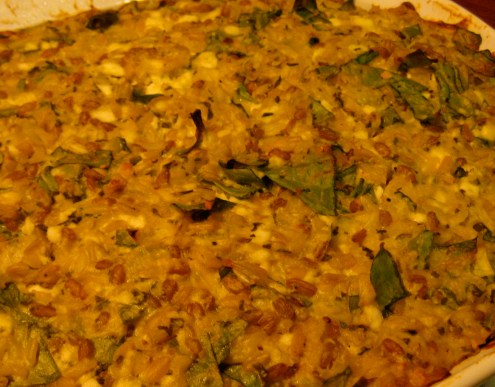 Saute onion in olive oil on medium-low heat until onion begins to color. Add garlic and saute a few minutes longer. Place cooked rice/pilaf in a mixing bowl. Add remaining ingredients except spinach and mix. Stir in spinach; how much you use depends how much you like spinach. I have, at times, added almost 10 oz and loved it. If you use more spinach, under cook your rice/pilaf slightly to help absorb additional liquid from the spinach. Pour mixture into a greased baking dish (I use 1 1/2 quart oblong casserole). The depth of the mixture should be less than 3 inches. Bake for 45 minutes. This dish goes well with chicken and fish.