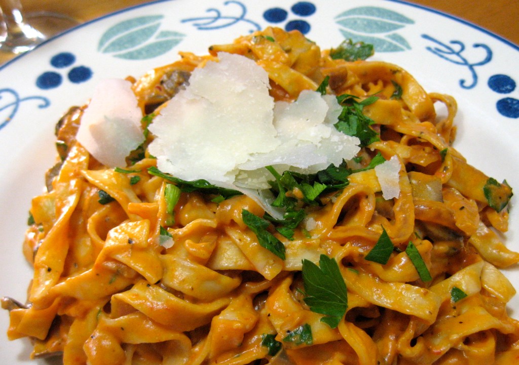 Heat a large skillet and add oil. Add sliced onions and mushrooms and saute for several minutes on medium heat until they begin to soften. Add garlic and cook 1-2 minutes more. Add sliced salami and cook for 2-3 minutes longer. Sprinkle flour over mixture and stir. Add tomato paste and cook for about one minute (watch your heat and don’t let this burn) Slowly add the can of evaporated milk, stirring constantly until sauce is smooth. Bring sauce to a low boil and then reduce heat to low. Add grated cheese and Tabasco sauce, and black pepper. Stir and let cheese melt. Pour sauce over cooked pasta and toss to mix. Add chopped parsley and toss again. Serve with Parmesan cheese. Enjoy!