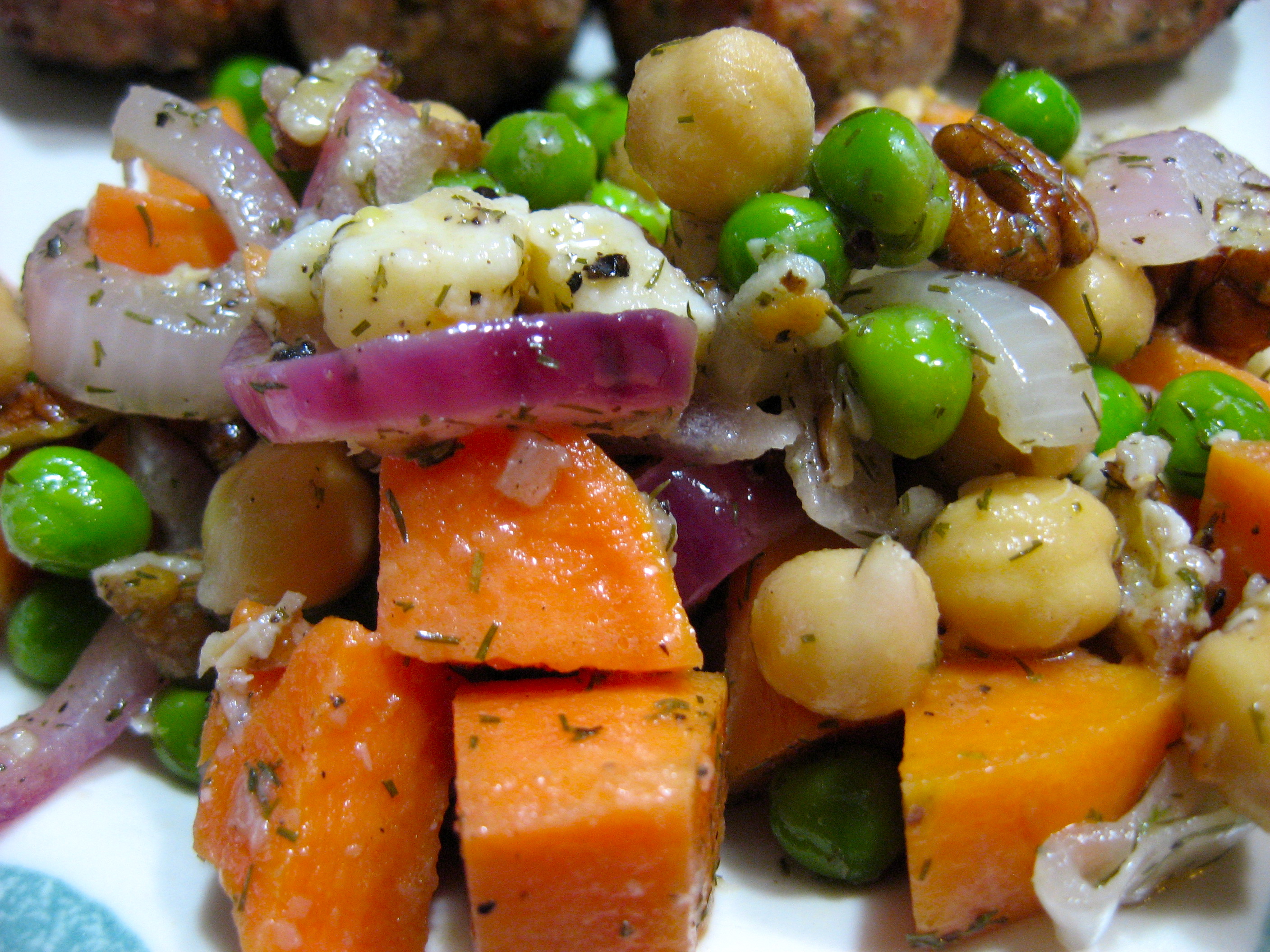 Place diced sweet potatoes in a microwave safe bowl. Add a sprinkle of water and loosely cover the bowl. Microwave for about 3 minutes on high power until potatoes are just tender. Drain water and sprinkle with salt and dill. Add chickpeas, mix and set aside. In a small heated skillet, add enough oil to saute onion and garlic. Add onion and saute until translucent, add garlic and saute a minute longer, do not brown. Add frozen peas and stir, coating the peas with the garlic and oil. Continue to stir until peas are just thawed. Add saute mixture to chickpea mixture. Add cubed cheese, vinegar, pecans and ground black pepper. Toss. Add additional olive oil and salt if needed. Serve warm or at room temp. Enjoy!