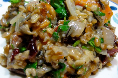 In a small bowl, combine cumin, cinnamon, lemon juice, orange juice, ginger and honey. Slowly add olive oil while stirring with a whisk to emulsify dressing. Combine pilaf and vegetable saute together. Add olives, cilantro and pour on dressing. Mix and add salt and pepper to taste. Serve warm or at room temp. Enjoy
