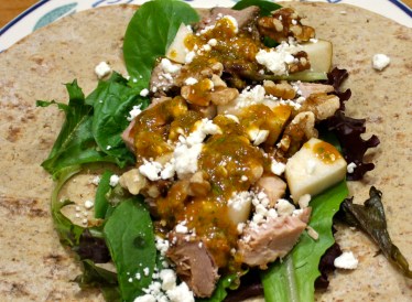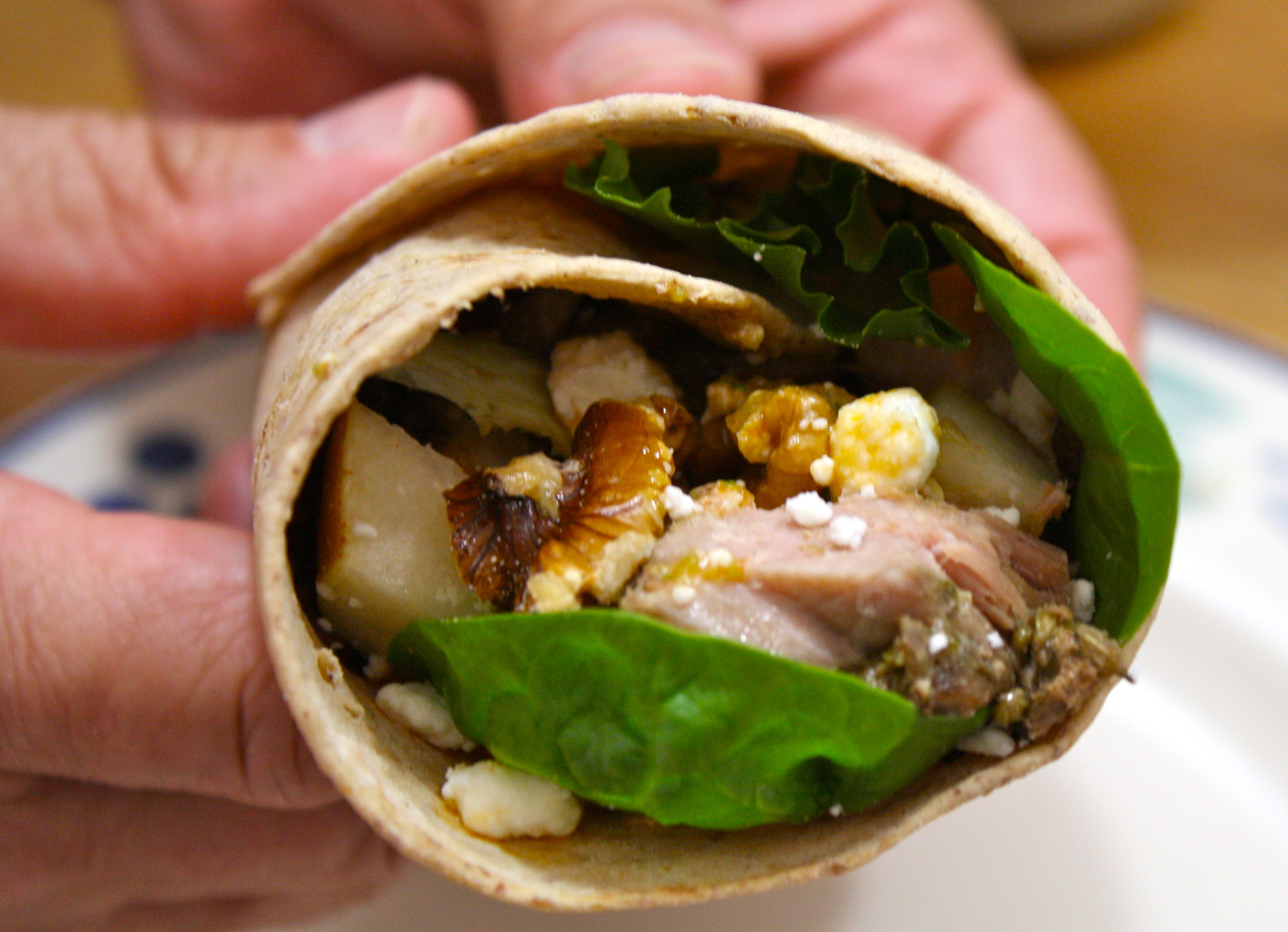 Lay your wrap out. Top with greens first, then pork, pear, walnuts, and Feta. Drizzle with dressing and roll up. Use toothpick to hold closed, if needed. Repeat. Serve immediately. Enjoy!