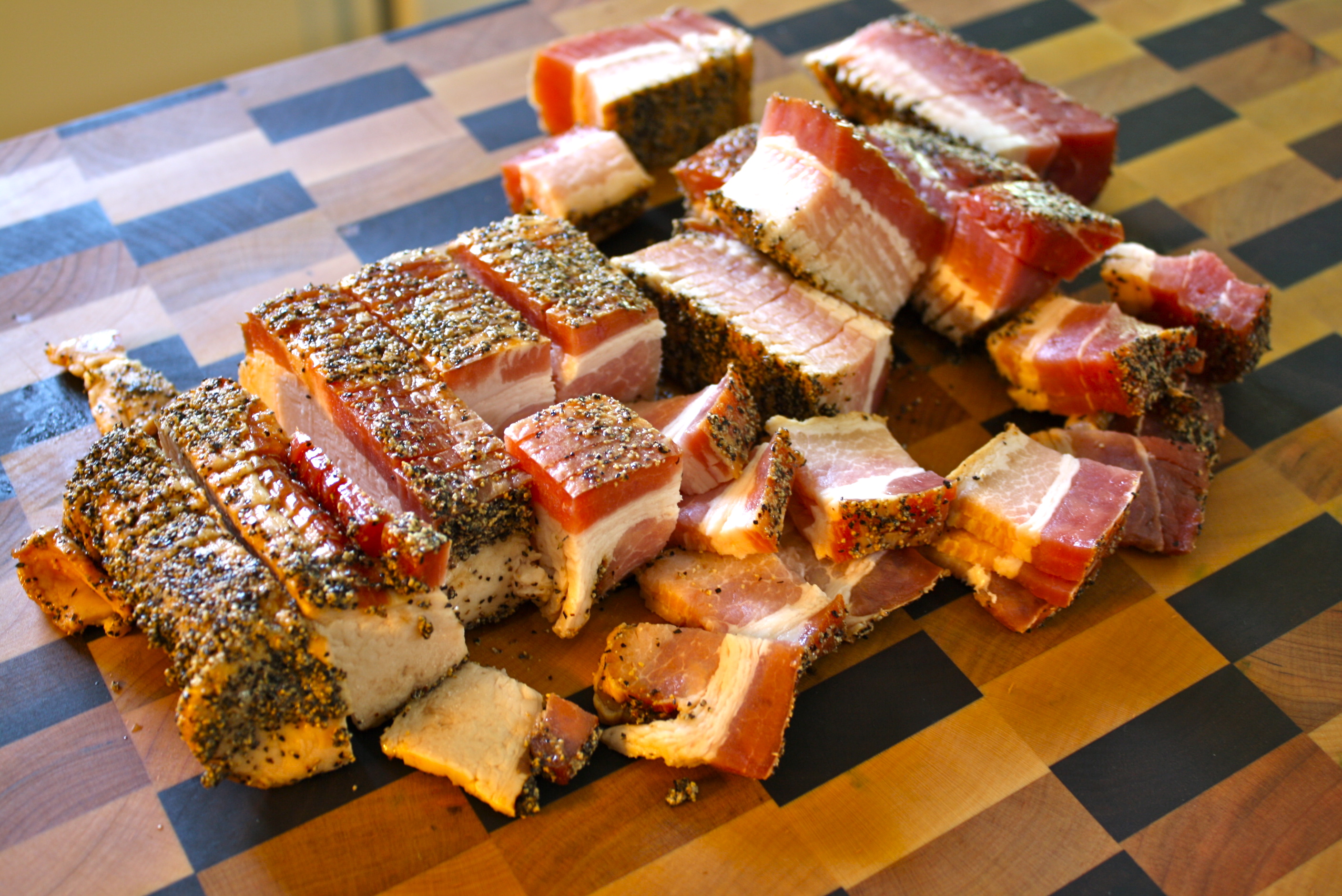 1 1/2 lbs hickory smoked pepper bacon, cut into 1 inch pieces