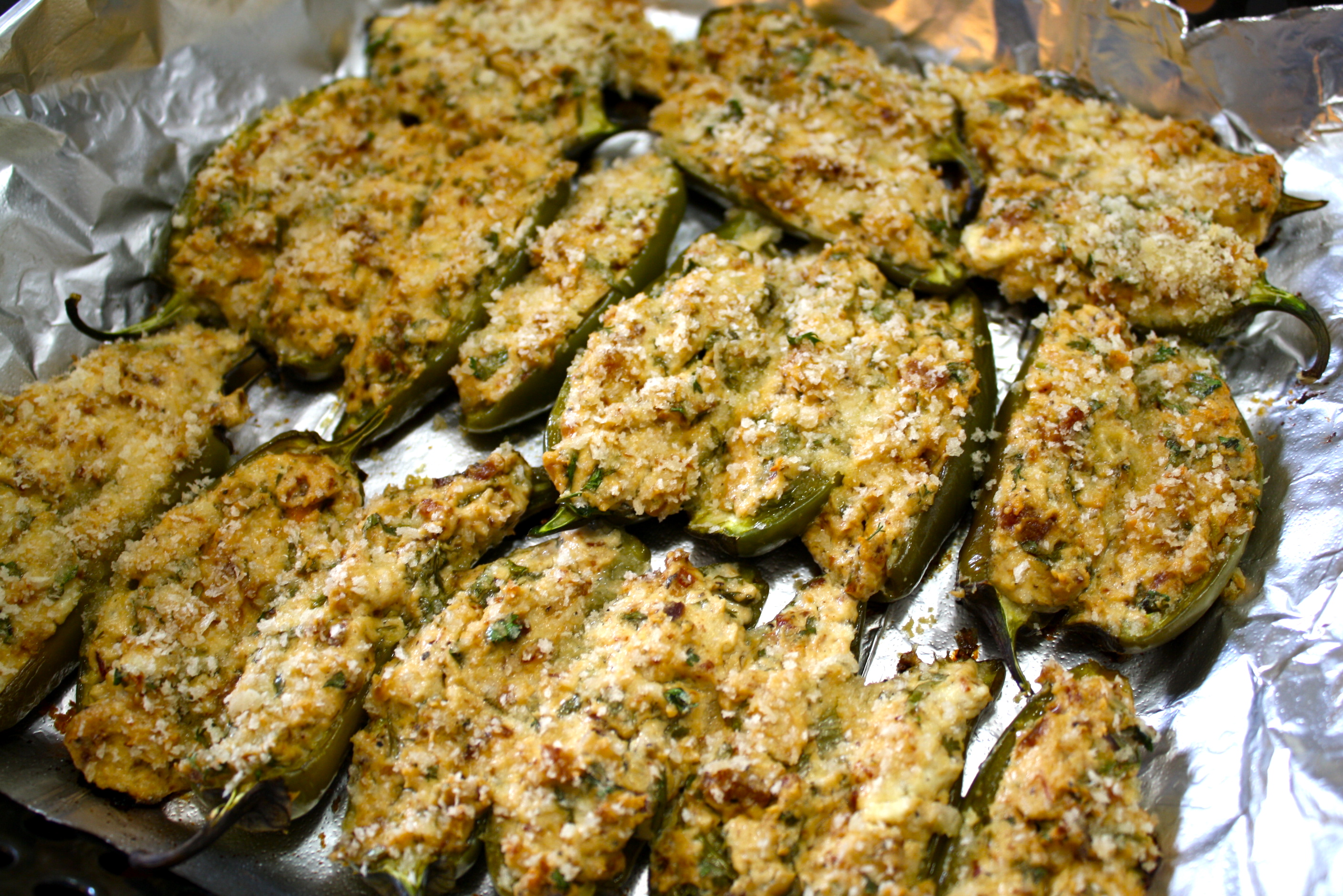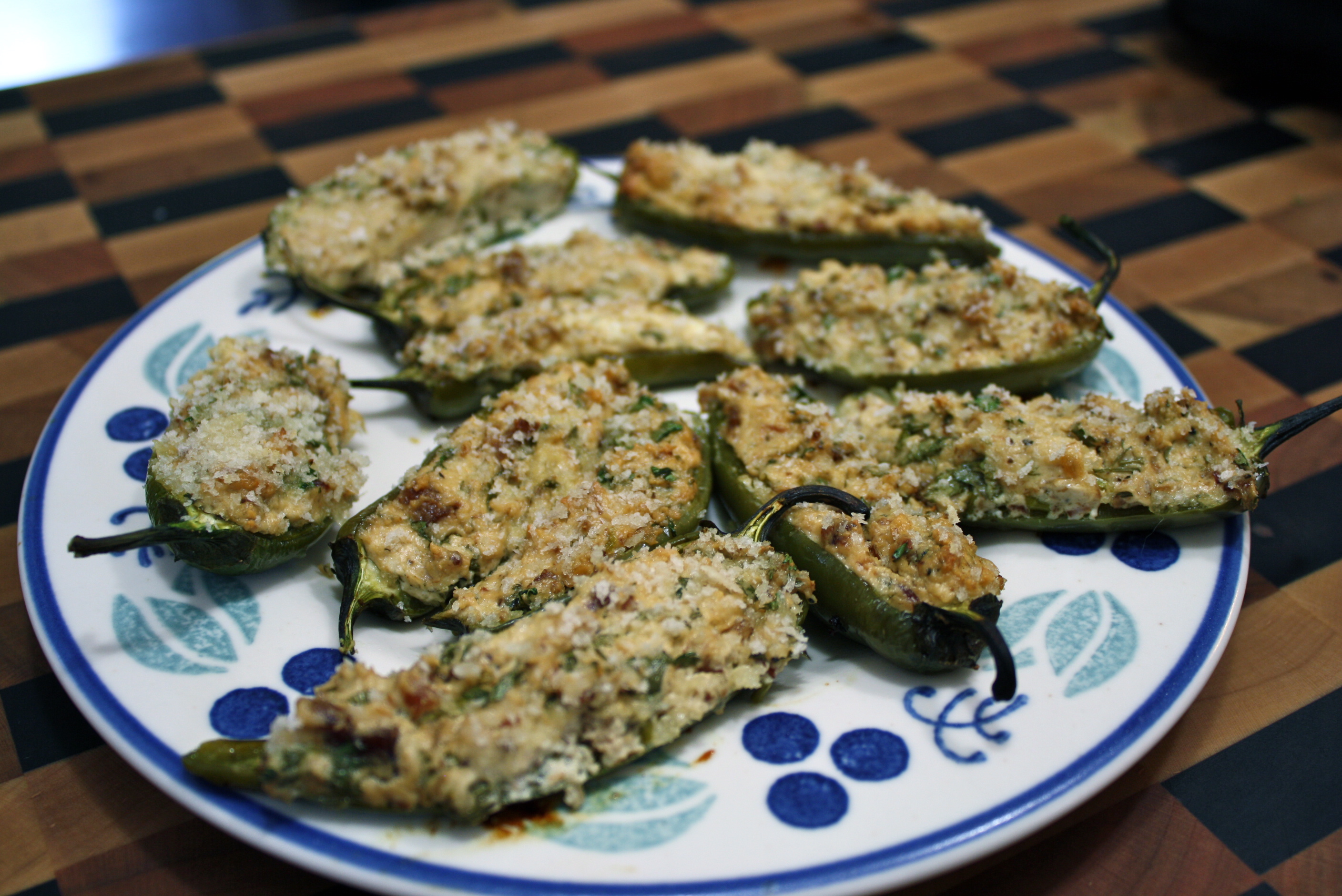 I have always liked jalapeno peppers, not too big or small, medium heat and great flavor. I’ve seen recipes for stuffed peppers, but almost all of them are done in the oven. When jalapenos are in season, its too hot to crank on the oven for appetizers. I wanted to put them on the grill but give them enough time to cook for the pepper to mellow and soften. If you turn down the heat, it works wonderfully. To give the filling enough flavor to stand up to the pepper itself, I used goat cheese with bacon jam and fresh cilantro. Top them with a sprinkling of panko bread crumbs for a little crunch on the top. I made them for my oldest son’s birthday celebration. We ate them first then had pasta with pesto sauce, grilled meatballs and broccoli and a dark chocolate cheesecake for dessert.