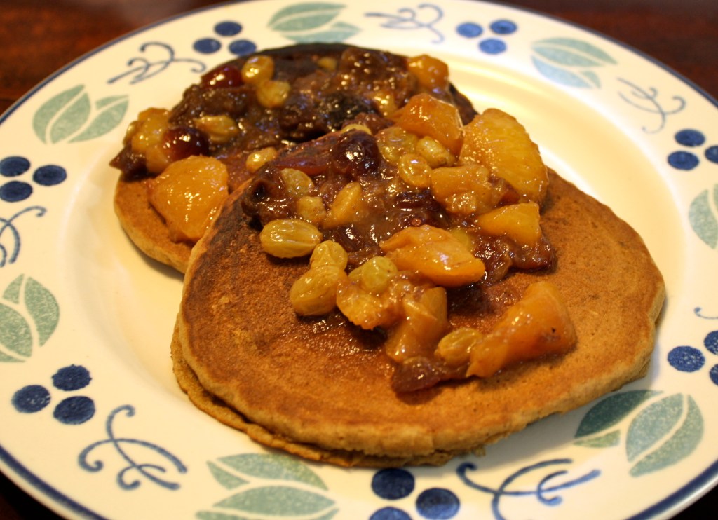 Combine wet ingredients in mixer or mix by hand. Combine all dry and ingredients and mix. Add to wet ingredients and mix just long enough to incorporate. Do not overmix. Drop 1/3 cup portions on hot greased grilled and cook until edges appear dry, about 1-2 minutes. Flip and cook other side. You can put your oven on warm (180F) and place a large plate into it. Place cooked pancakes on plate to keep them warm while cooking the rest of the batch. Serve pancakes with warm compote over the top. Enjoy!