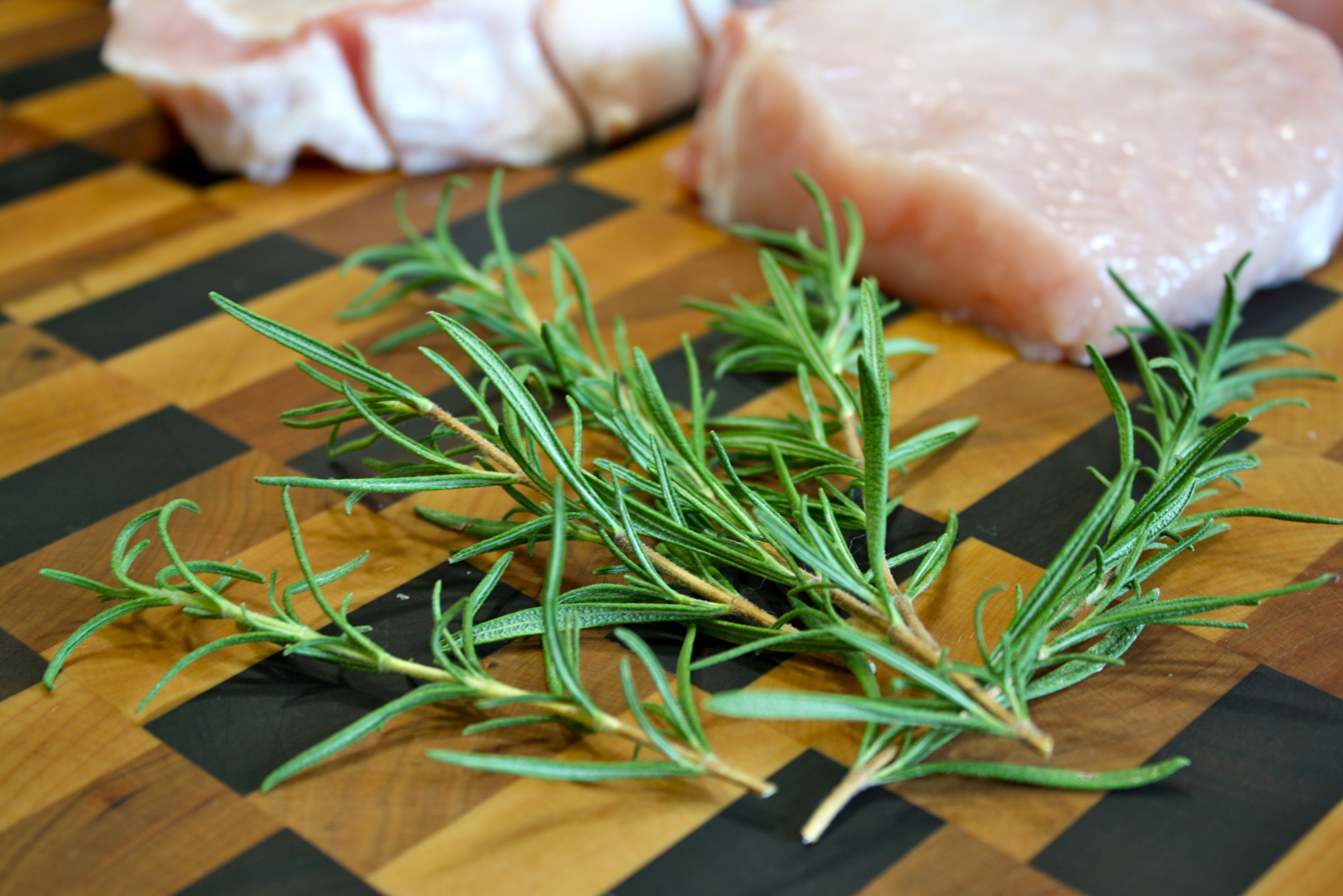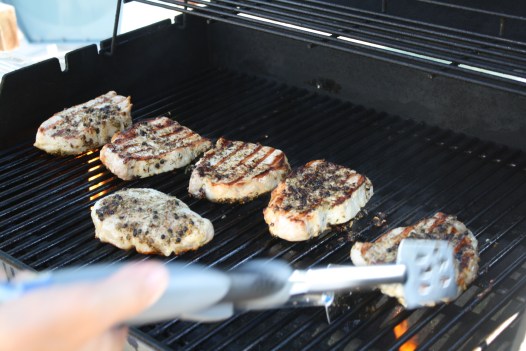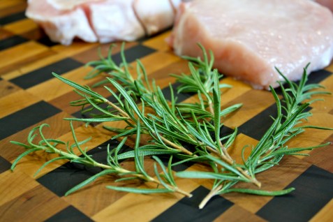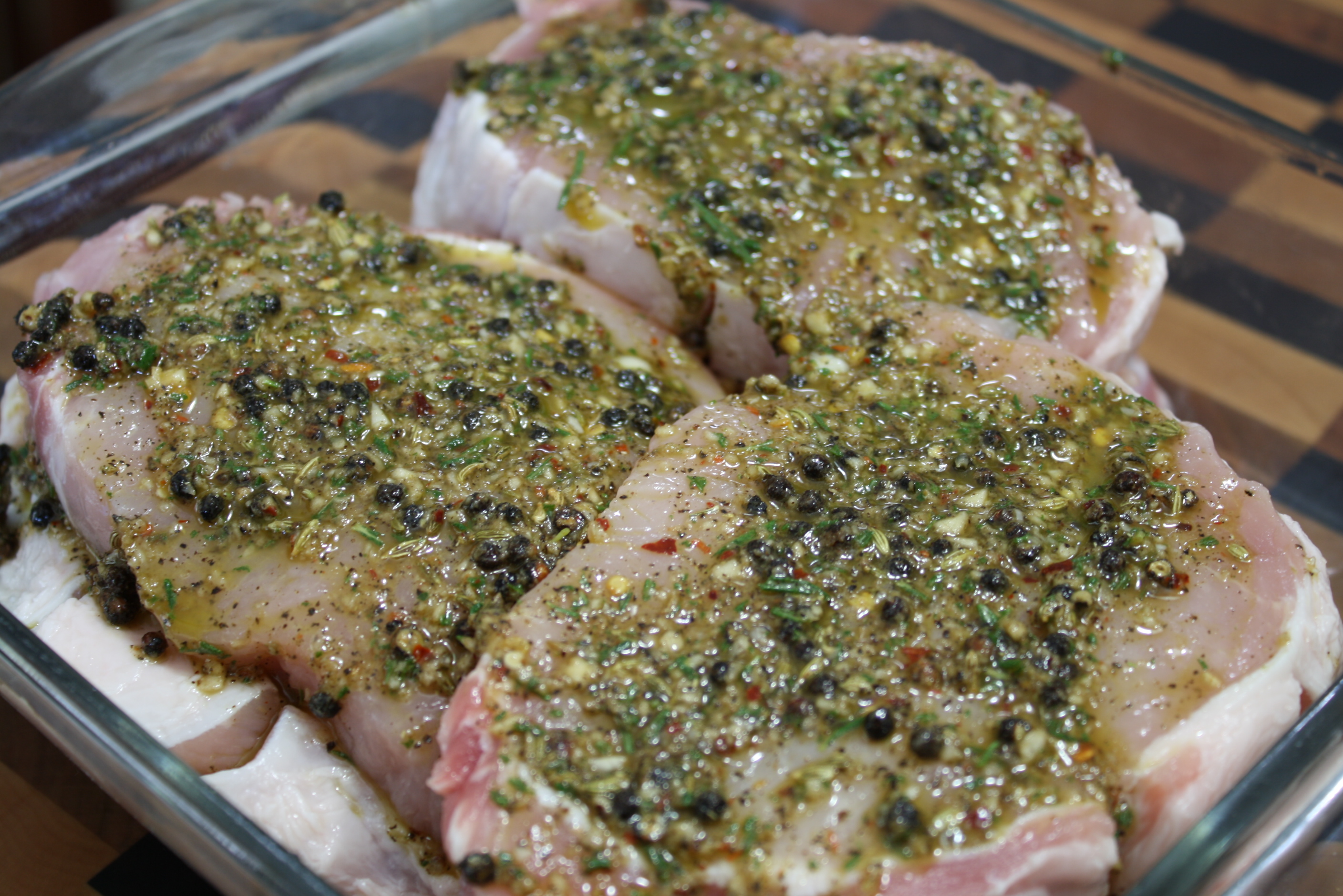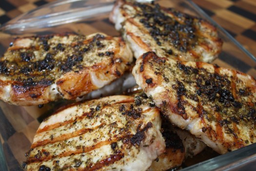 Pork is nice because it will take a wet rub (thick like a paste) and flavor quickly, in as little as 2 hours. Not as fast as seafood (or expensive), but much faster than beef. One of my favorite wet rubs is one with rosemary, garlic, and lemon juice with some olive oil to hold it all together. Make this paste and smear it on the sides of the chops. To make the it do “double duty” I stack my chops like a sandwich, stacked 2 chops high with the rub in between. It keeps you from having to make so much to do all of the pork. Let them sit like this for 1 1/2 hours in the frig. Take them out 30 minutes before your going to grill to give the pork time to warm up before cooking.