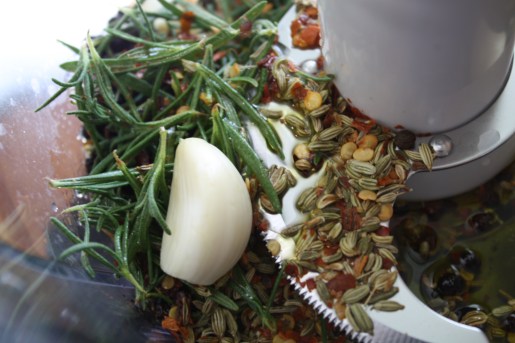 Process until garlic is well chopped and rosemary is in small pieces. It will be chunky. Using a spatula, smear the mixture on both sides of each chop, or stack them sandwich like (its what I do) to save time and rub.