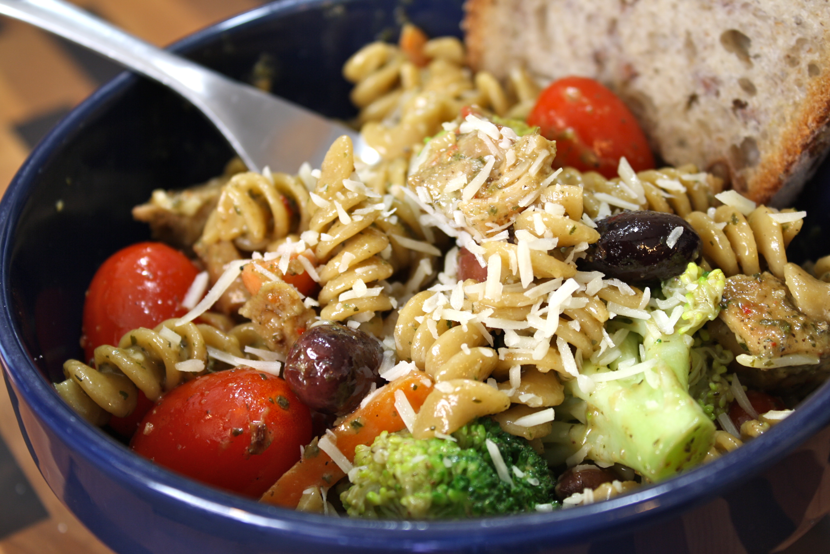 Put a large pot of water to boil. Add salt after boiling. Add one package of your favorite pasta (I like farfalle or rotini) Cook until al dente, drain and return to pot.