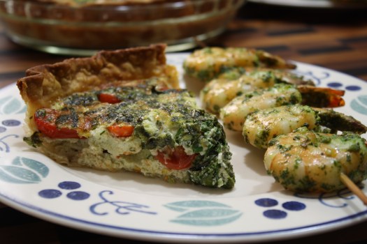 My youngest son has gone to visit his college age brother this weekend and my husband and I have been left to fend for ourselves. My son is not a big fan of fresh tomatoes or shellfish so……we decided to have grilled shrimp with pesto and a grape tomato and basil pie. They were so good that I almost forgot to miss Aidan!