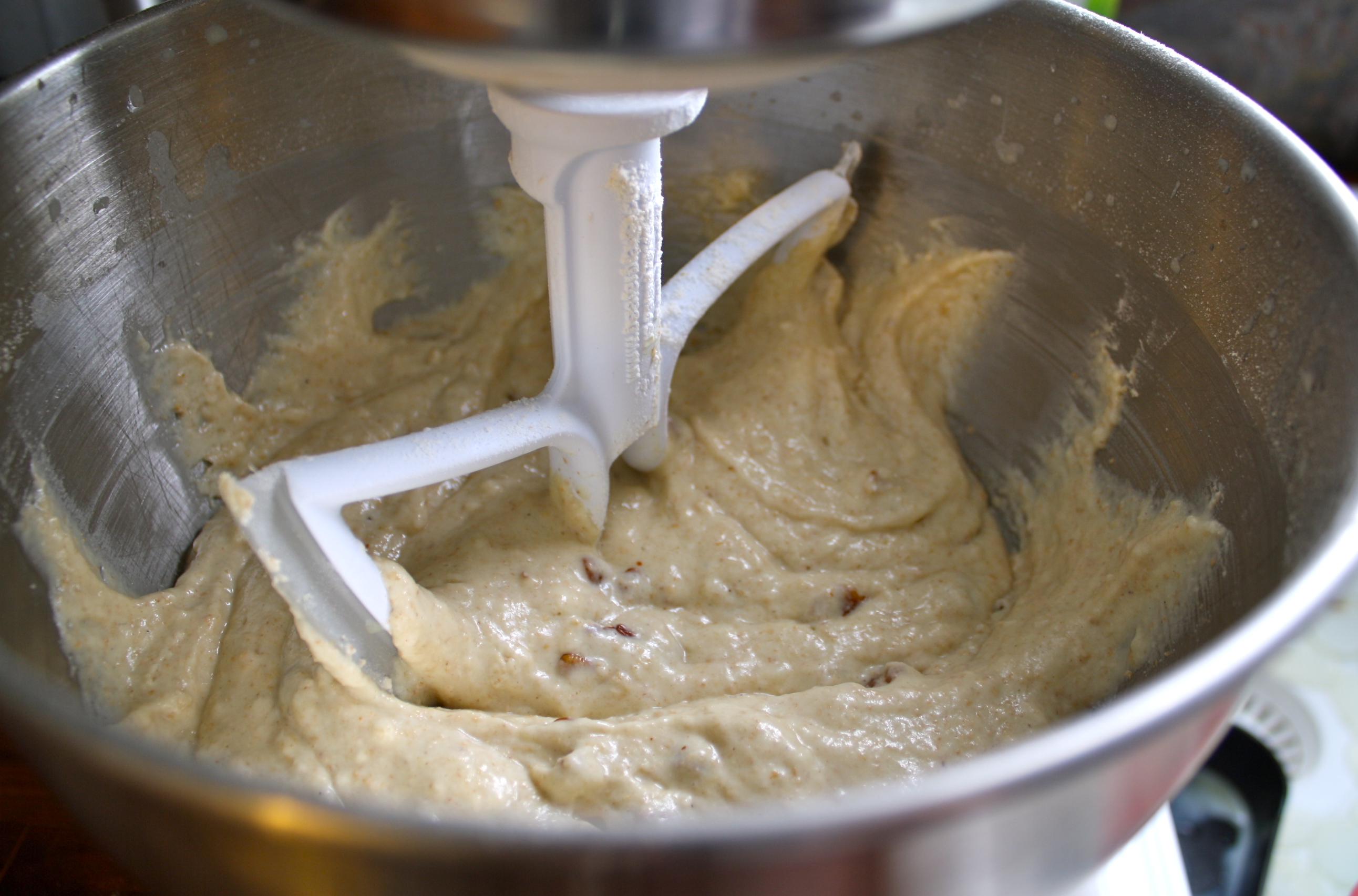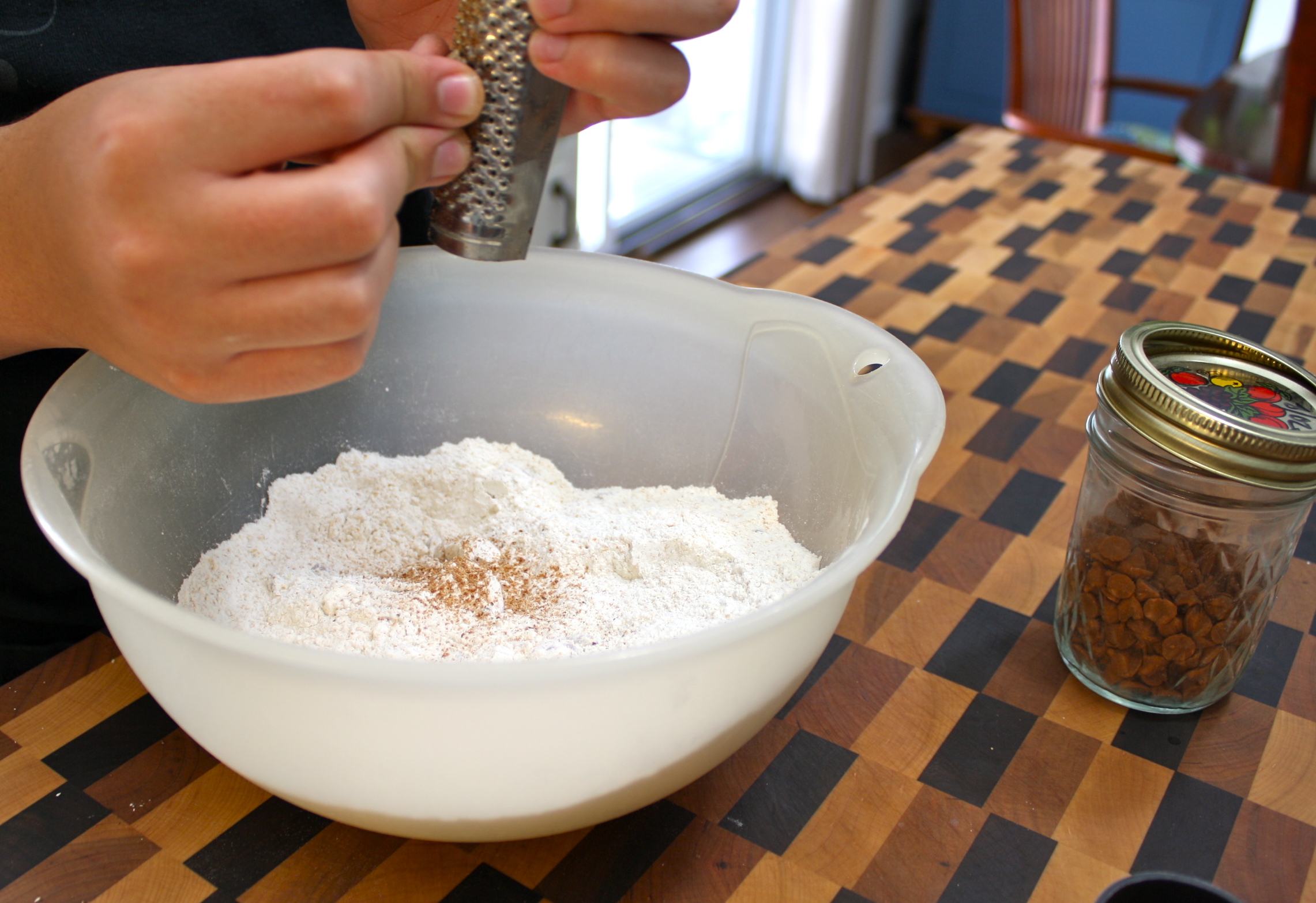 In a medium bowl, combine both flours, sugar, baking powder, salt, nutmeg, cinnamon chips and pecans. Set aside. In your mixing bowl, combine remaining ingredients until mixed. With speed set on low, gradually add the dry mixture and mix until just combined.