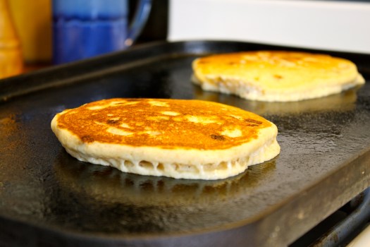On a heated griddle (mine is cast iron), place 1/3 cup scoops and cook over medium low-heat until edges begin to dry. Flip and cook the other side.
