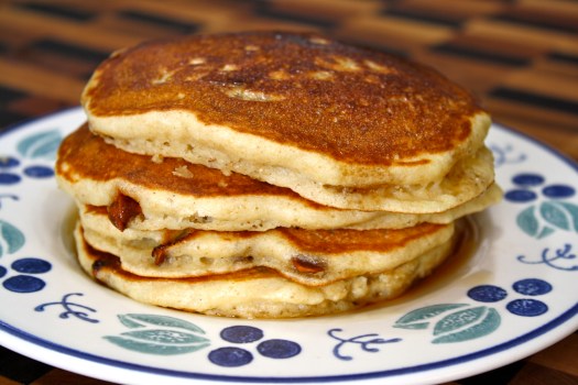 My son stated that he is “in serious need of some pancakes”. He stated this enough times that I relented….it has been awhile. I decided to let him make them for dinner tonight. He loved the idea and started looking for recipes. He found one for cinnamon chip pancakes, but the recipe needed help. So we gave it. Added whole wheat, buttermilk, orange juice, pecans and just a little nutmeg.