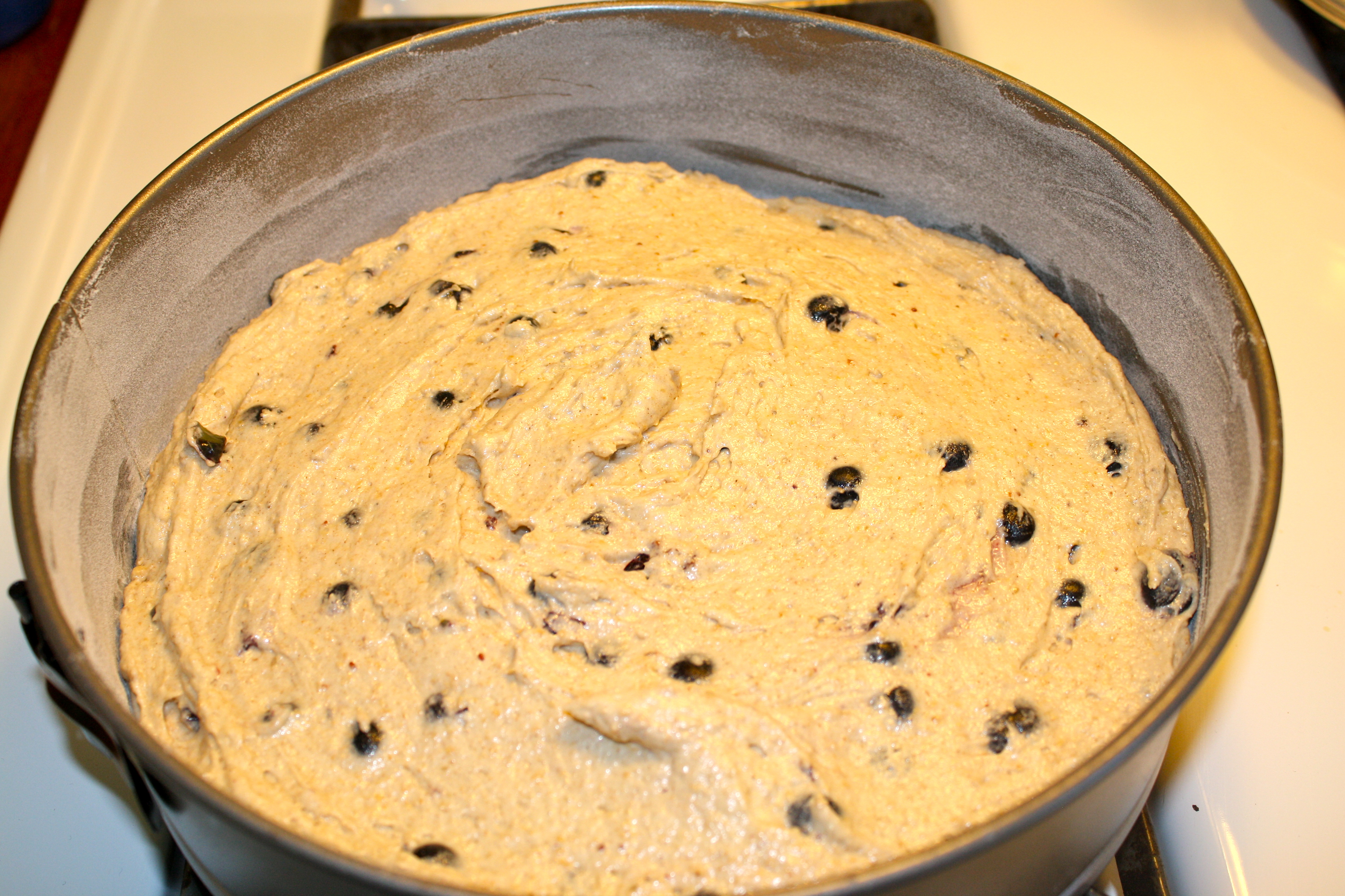 For the wet ingredients use a medium mixing bowl; combine sugar, shortening and vanilla. Beat until well combined. Add egg, half and half, yogurt and OJ. Beat again, dairy will clump (its OK). Add combined dry ingredients and mix. Add blueberries and stir until just combined. Place in spring-form pan and smooth batter to the sides of the pan.