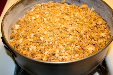 Using the bowl the dry ingredients were in, combine topping ingredients. Use a fork to mix in butter pieces or use your fingers to mix until crumbly. Sprinkle over prepared batter.
