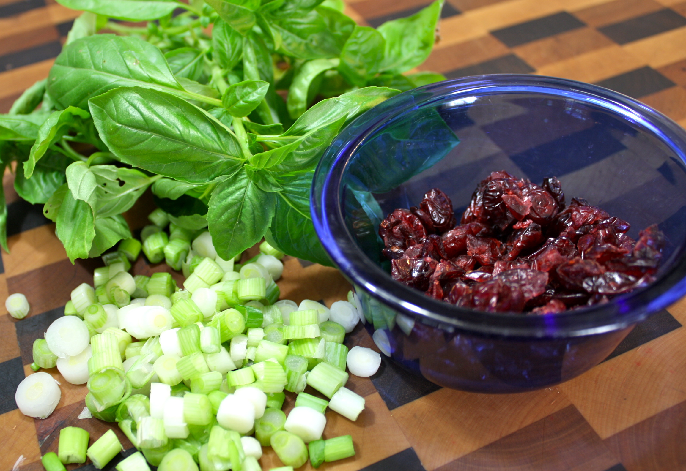 My husband was going to grill some steak pieces tonight, so making a wild rice salad sounded like a good idea. A simple dressing of olive oil, balsamic vinegar, and soy sauce, add some basil and dried cranberries for a little sweetness, pecans and green onions for crunch, and some feta cheese to balance all the flavors.