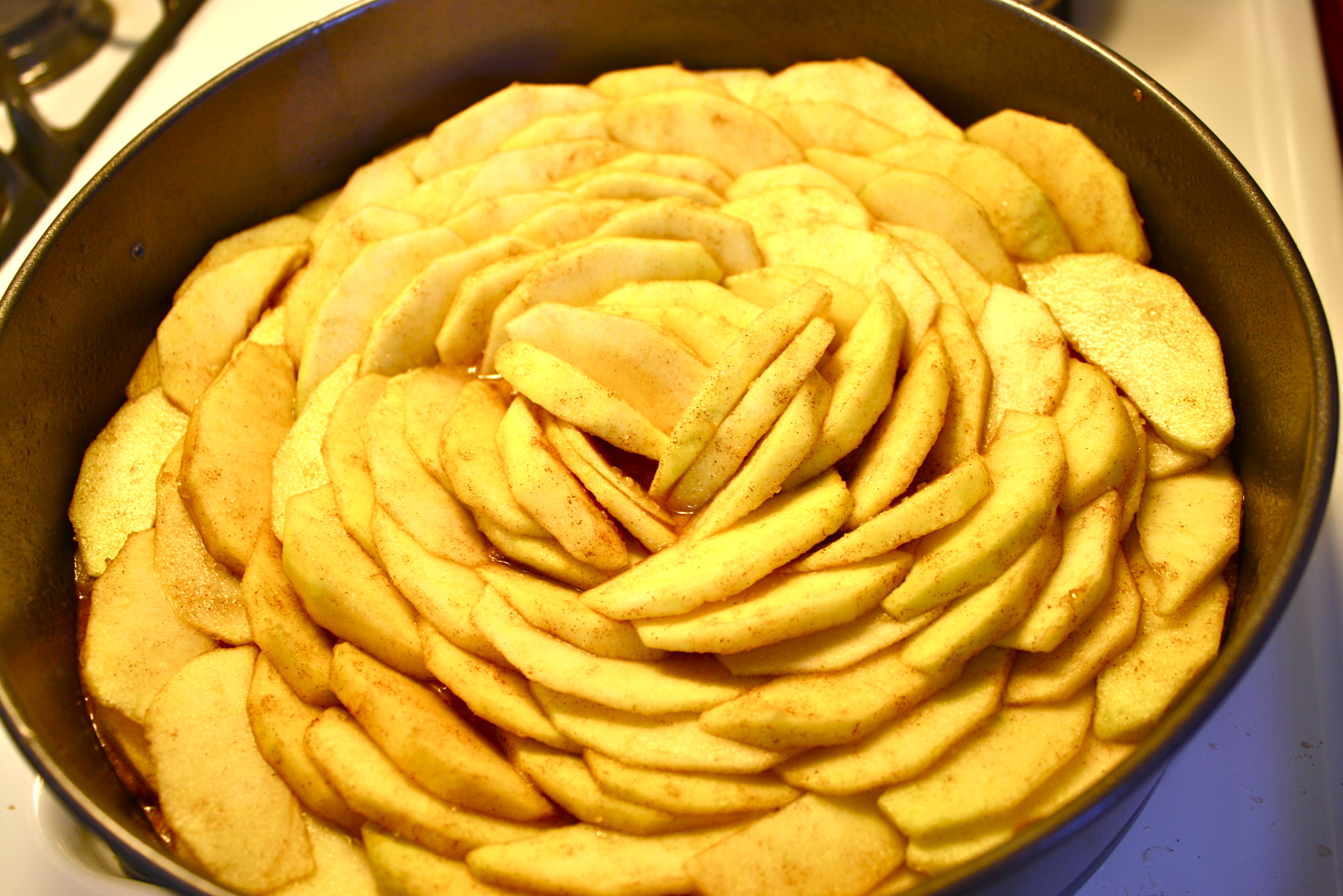 Alternately add dry ingredients and hot cider to wet mixture until just combined. Do not over mix. Pour batter into spring form pan and spread into an even layer. Arrange apple slices over the top of cake batter, beginning at the outer-most edge and working inward overlapping slices as you go. Sprinkle additional raw sugar over the top of apple slices, if desired.