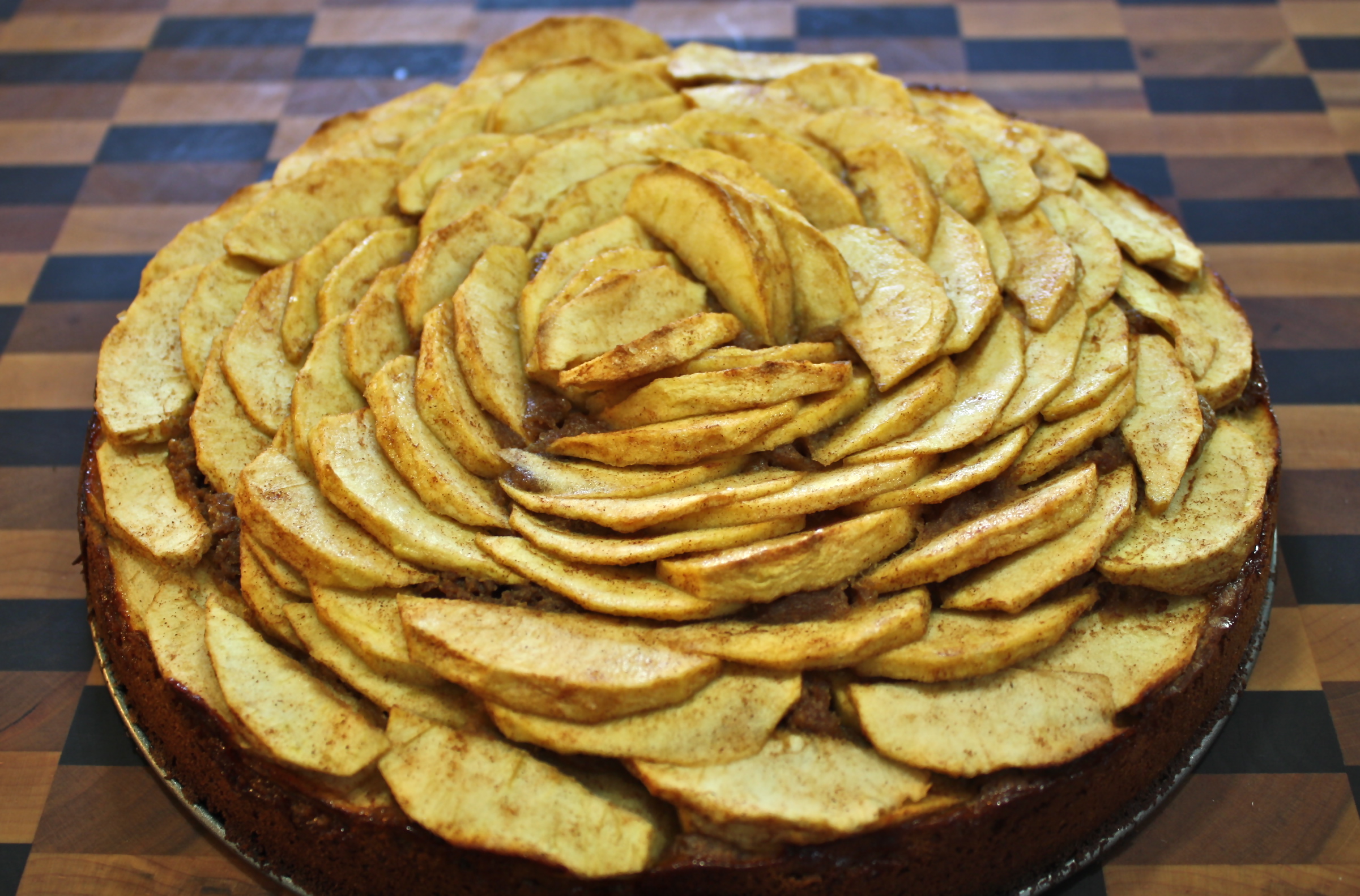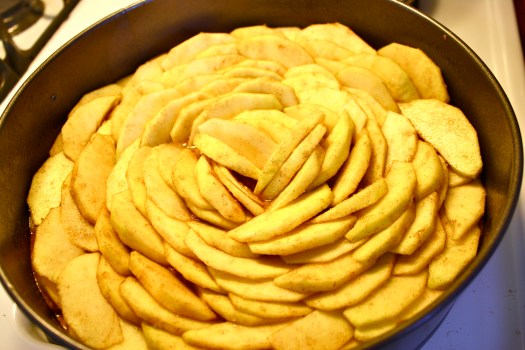 This is a spice cake more like a gingerbread than what most people think of as spice cake, although this cake has no ginger in it. Many people do not know coriander (the seed from the cilantro plant) is a great pairing with cinnamon. This is an apple cake (3 ways) spiced with cinnamon and coriander. The cake has apple butter and apple cider in it and is topped with thin apple slices that bake and add their juices to the cake during baking. A very moist cake with delightful flavors. By slicing the apples very thin and arranging them circularly, it looks like an open flower….an apple blossom you might say.