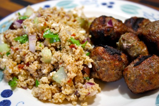 With the rain gone and mild temperatures, Jim decided to make grilled meatballs. I had found a new couscous recipe that I wanted to try that was more traditional. Fresh herbs, olives, cucumbers and feta. The twist is using sun dried tomatoes since I don’t have fresh tomatoes anymore. By adding them to the couscous while it cooks, you get more flavor!