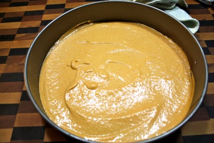 Its a 2 part cake. The bottom layer is chocolate, covered by a second pumpkin layer with cheesecake overtones. You put a little more chocolate on the top. I tried to do some shapes that I hoped would look like spiders. Since I had never done one before, I wasn’t very good. So I went for the ghost/spirit look. I’m sure with some practice or maybe use a ziplock bag with the tip cut off, you could make some pretty cool designs. Anyway….you get the idea.