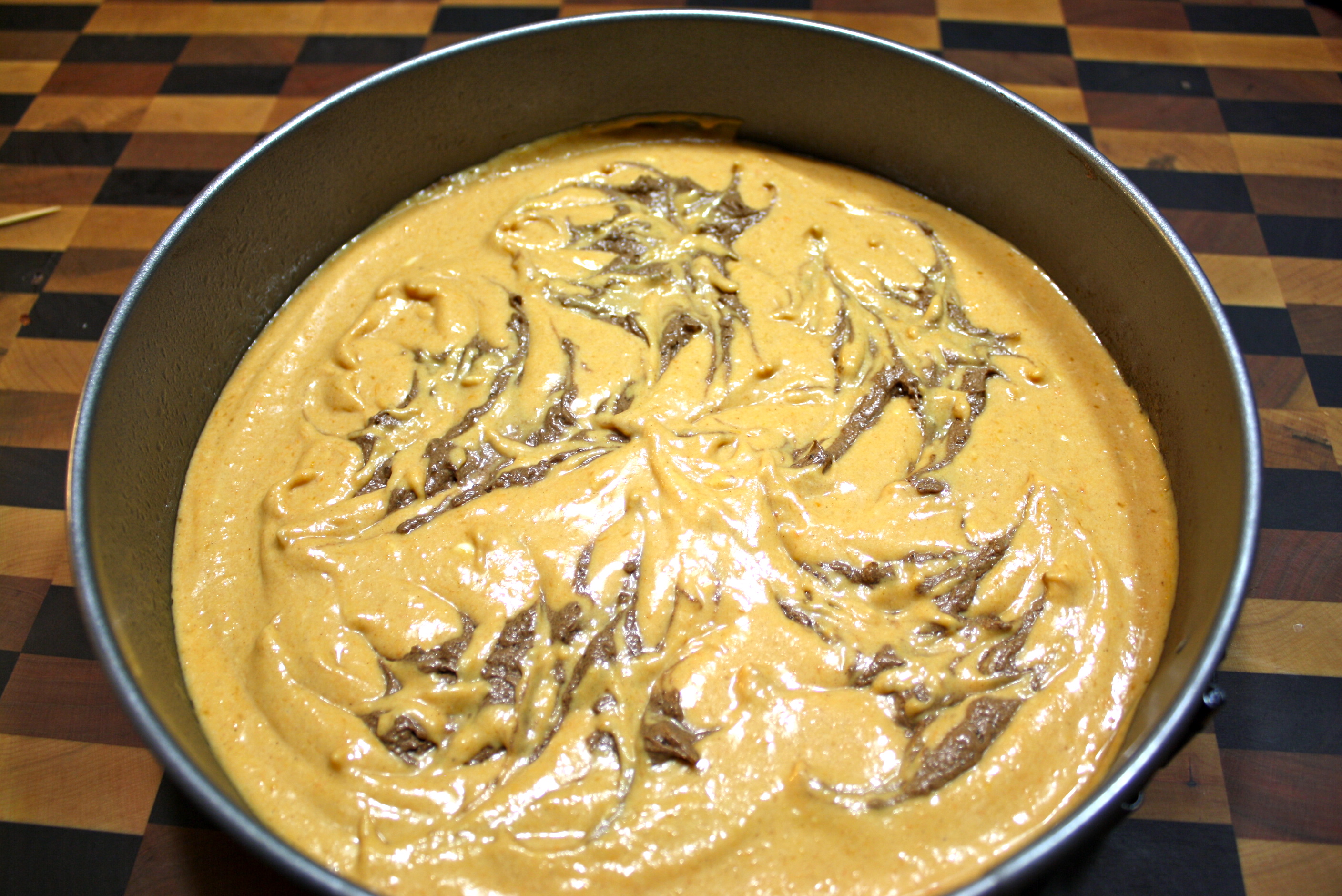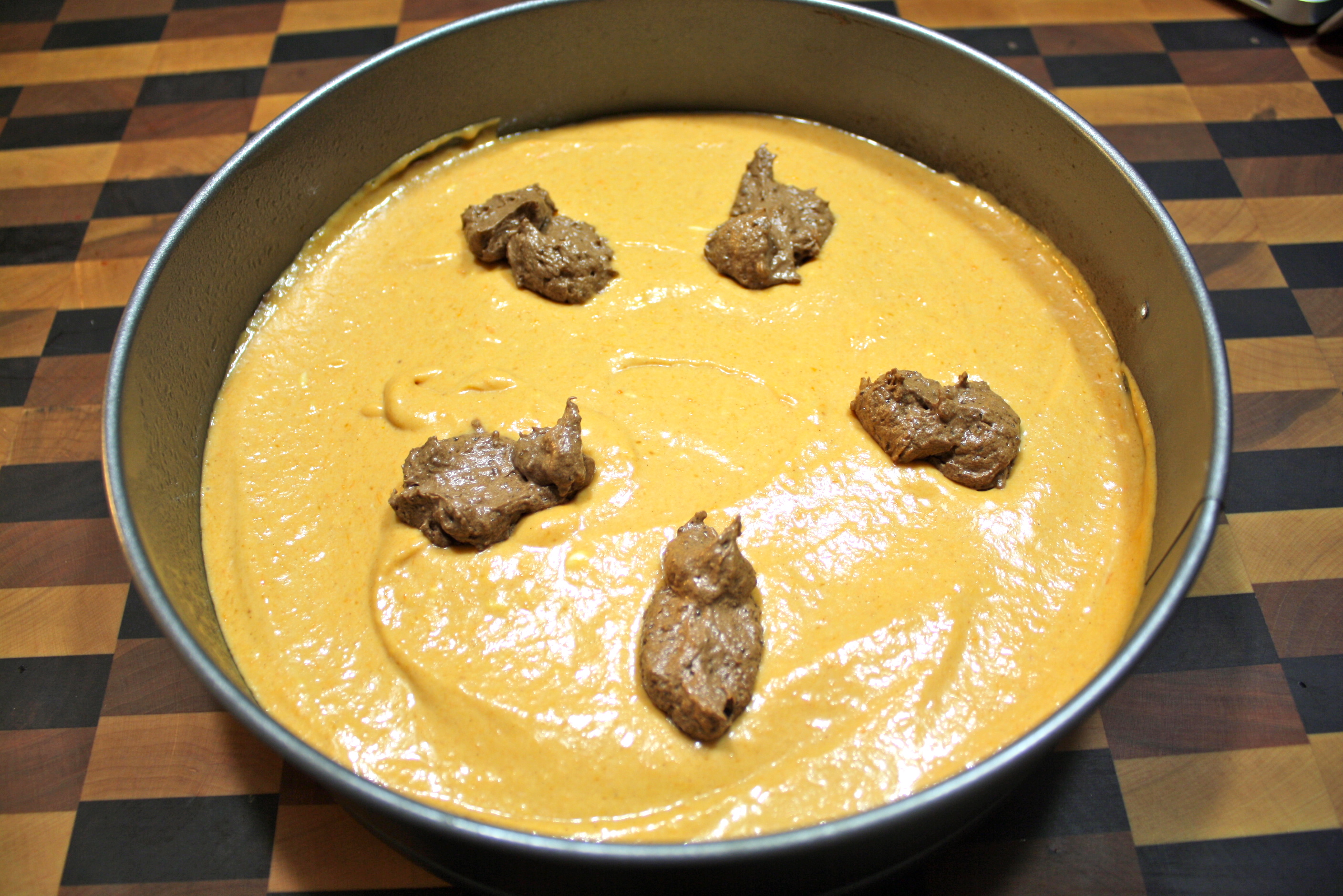 Use your stand mixer and bowl to combine ingredients for the pumpkin mixture. Pour the pumpkin mixture over the chocolate one. Use the reserved chocolate mixture to make shapes over the top of the pumpkin. With a table knife swirl until you like the pattern or use a zip lock bag with the tip cut off to draw your shapes and then smooth the edges. Bake for about 35-45 minutes until set and toothpick comes out almost clean.