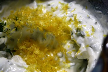 Fresh herbs, a little garlic, feta cheese, lemon zest and juice with the yogurt make such a great sauce that my son seemed to think it was a dip for him to enjoy while I cooked. I finally had to chase him off so I would have enough for dinner. With the mild fall I still have fresh oregano and rosemary. The basil I had already rounded up in my food processor earlier this summer with olive oil and lemon juice and froze in half pints.