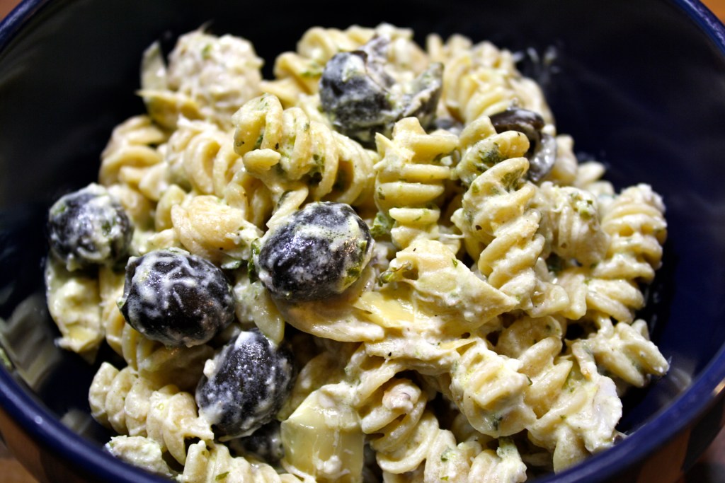Once pasta is cooked and drained, add yogurt herb sauce, artichokes, olives and crabmeat. Toss everything together. Taste and add salt, if desired. Serve immediately. Enjoy!