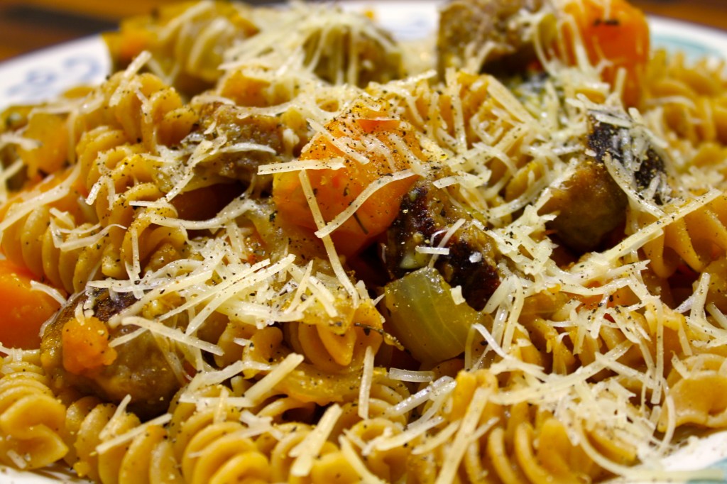 This recipe also has great autumn flavors; sage, thyme and butternut squash. It is also pretty quick to prepare, about 45 minutes. Sauteing the onions, squash and sausage together lets all the flavors blend and compliment each other. The flavor is so wonderful that all you need to add is the pasta and a sprinkling of parmesan cheese.