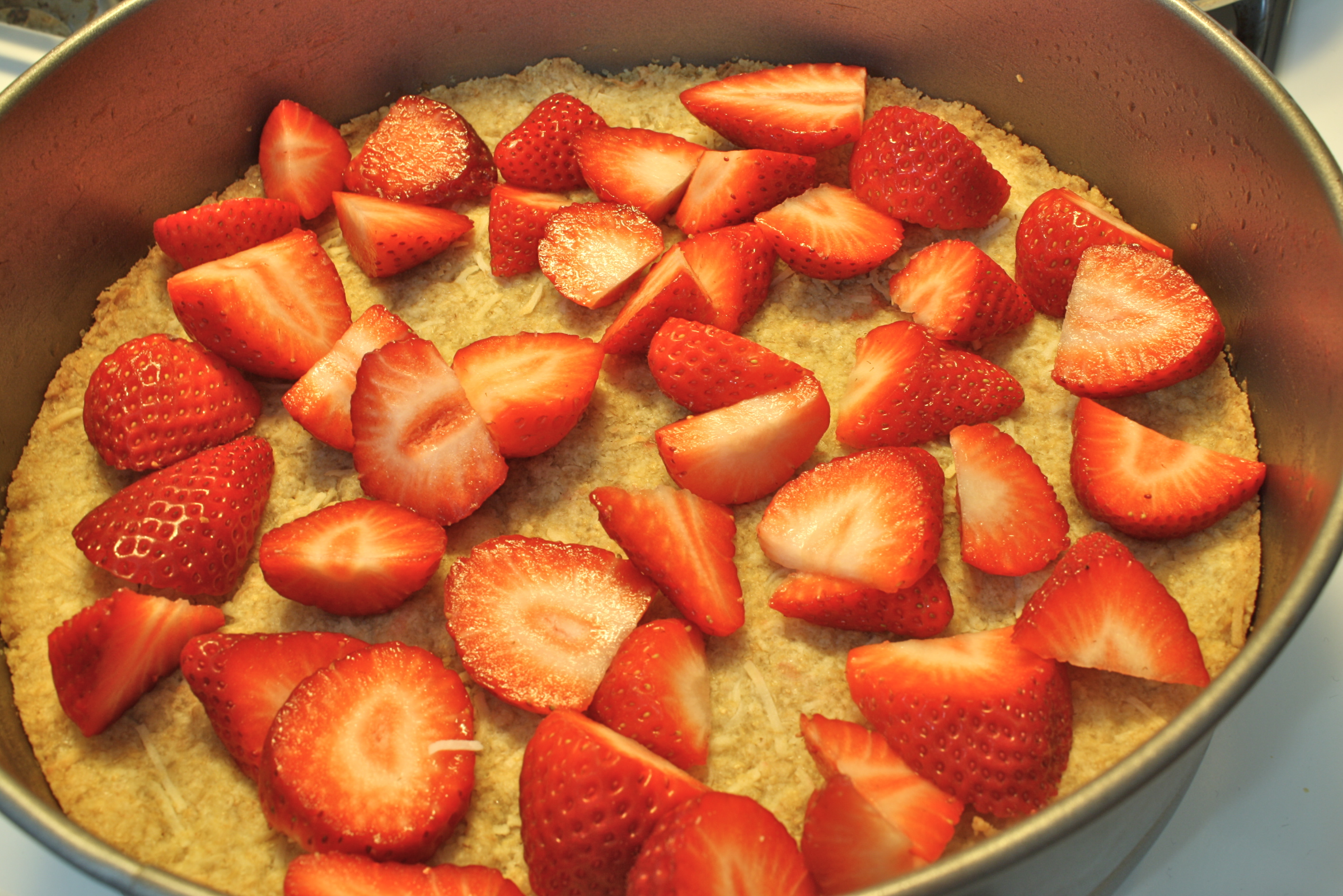 In a medium bowl, combine flour, coconut, sugar and salt. Add olive oil and stir until mixture just barely comes together (still somewhat crumbly). Dump mixture into the spring-form and use your hands to press it down into the bottom of the pan in an even layer. You do not need to press it up the sides. You can use a spatula to help flatten it if you like. Bake this in the oven for about 15 minutes or until the crust just begins to color. Remove and set aside to cool.