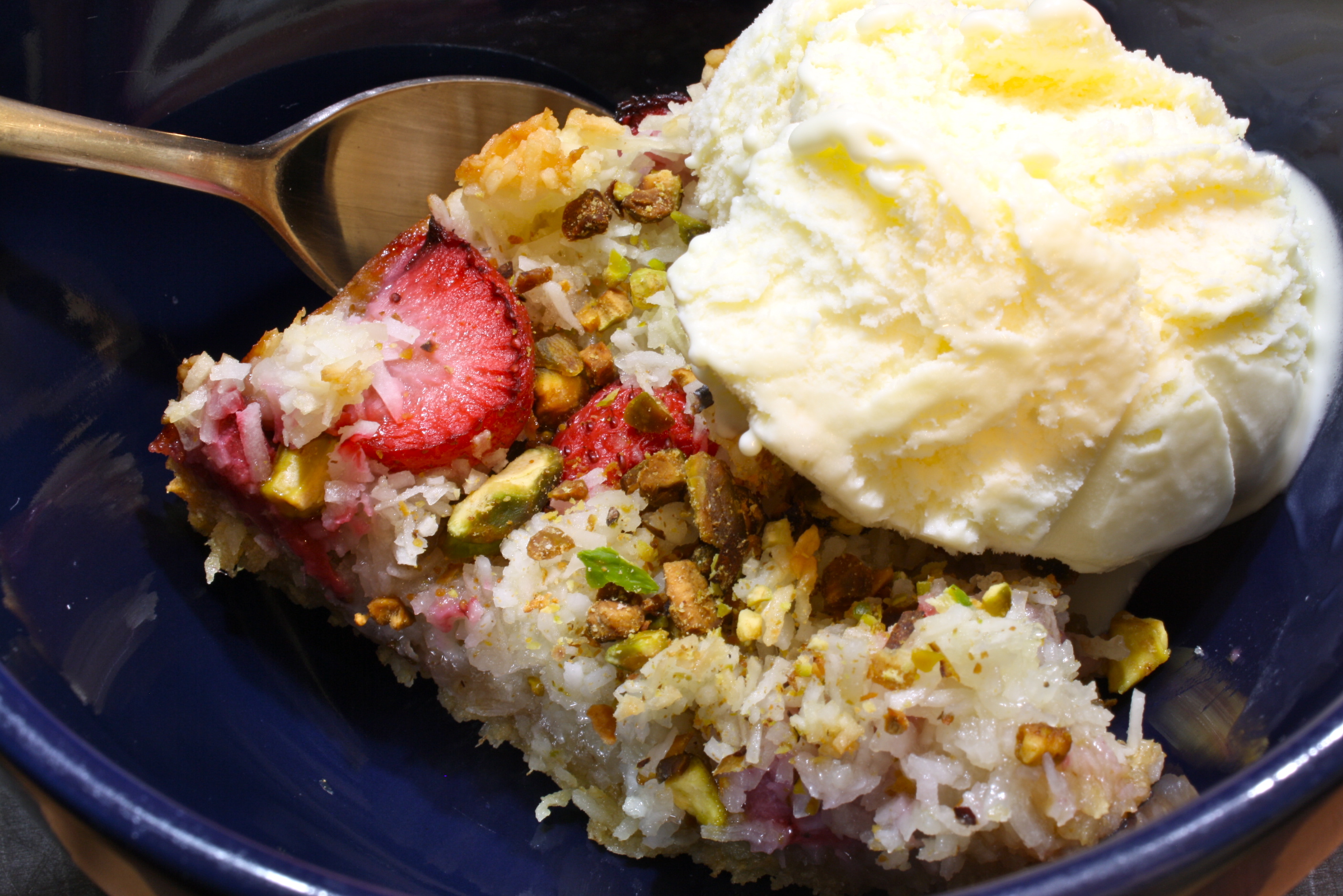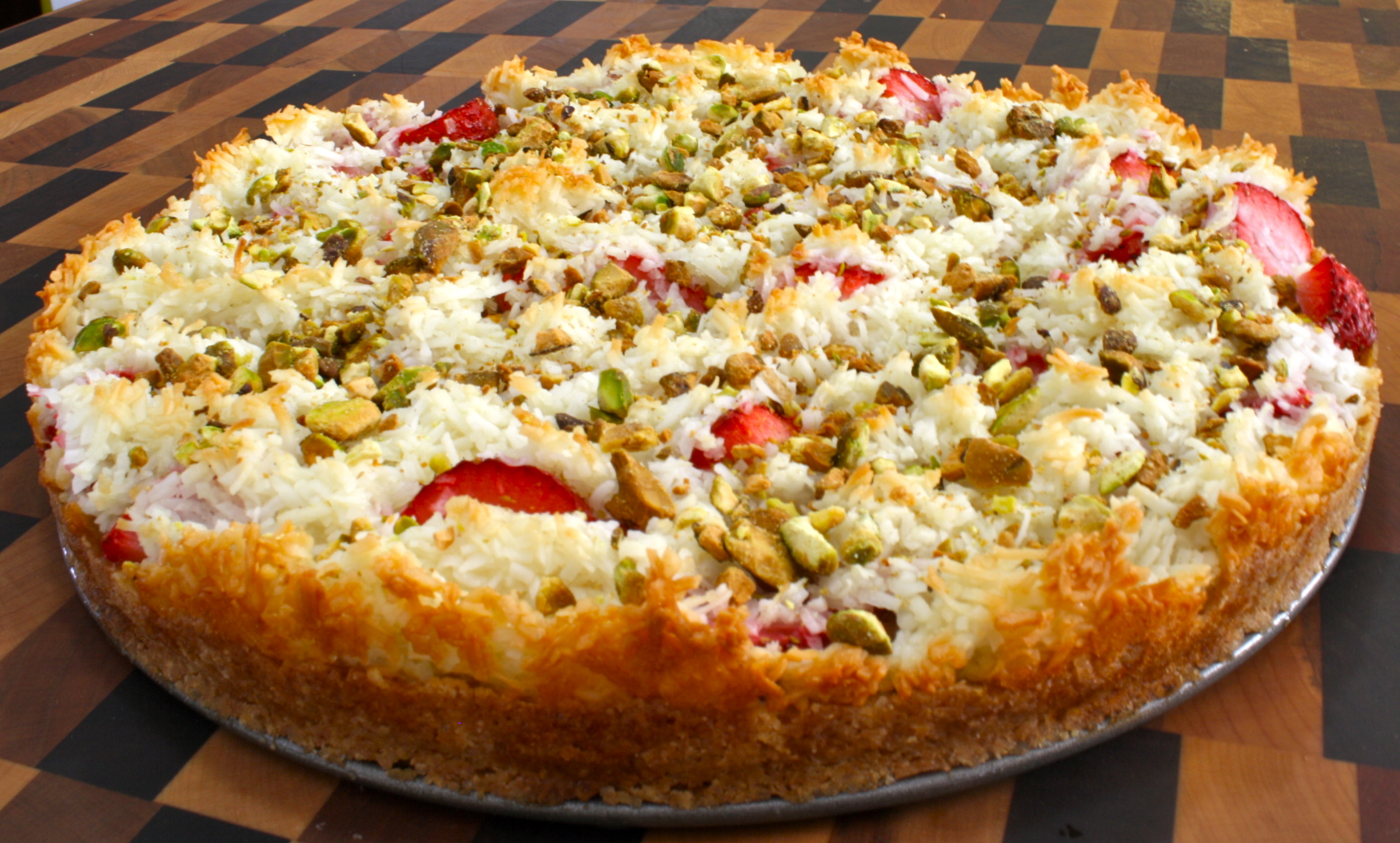 Place pan in oven and bake for 25 minutes or until coconut has a nice golden color. Remove and allow to cool. Sprinkle crushed pistachios over the tart. Remove the sides and cut into slices. Serve with a scoop up vanilla ice cream. Enjoy!