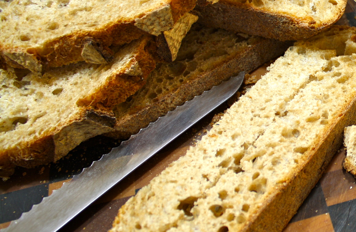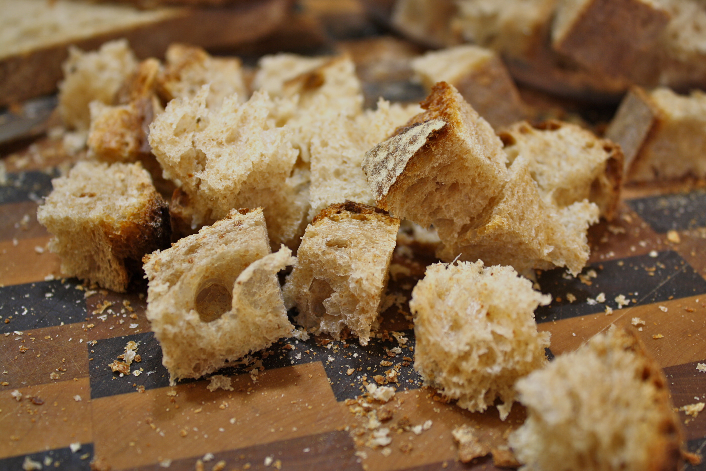 One medium sized loaf of your favorite crusty bread ( I get the day old stuff at the local bakery-whole grain if you can), cut into 1 to 1 1/2 inch size cubes.