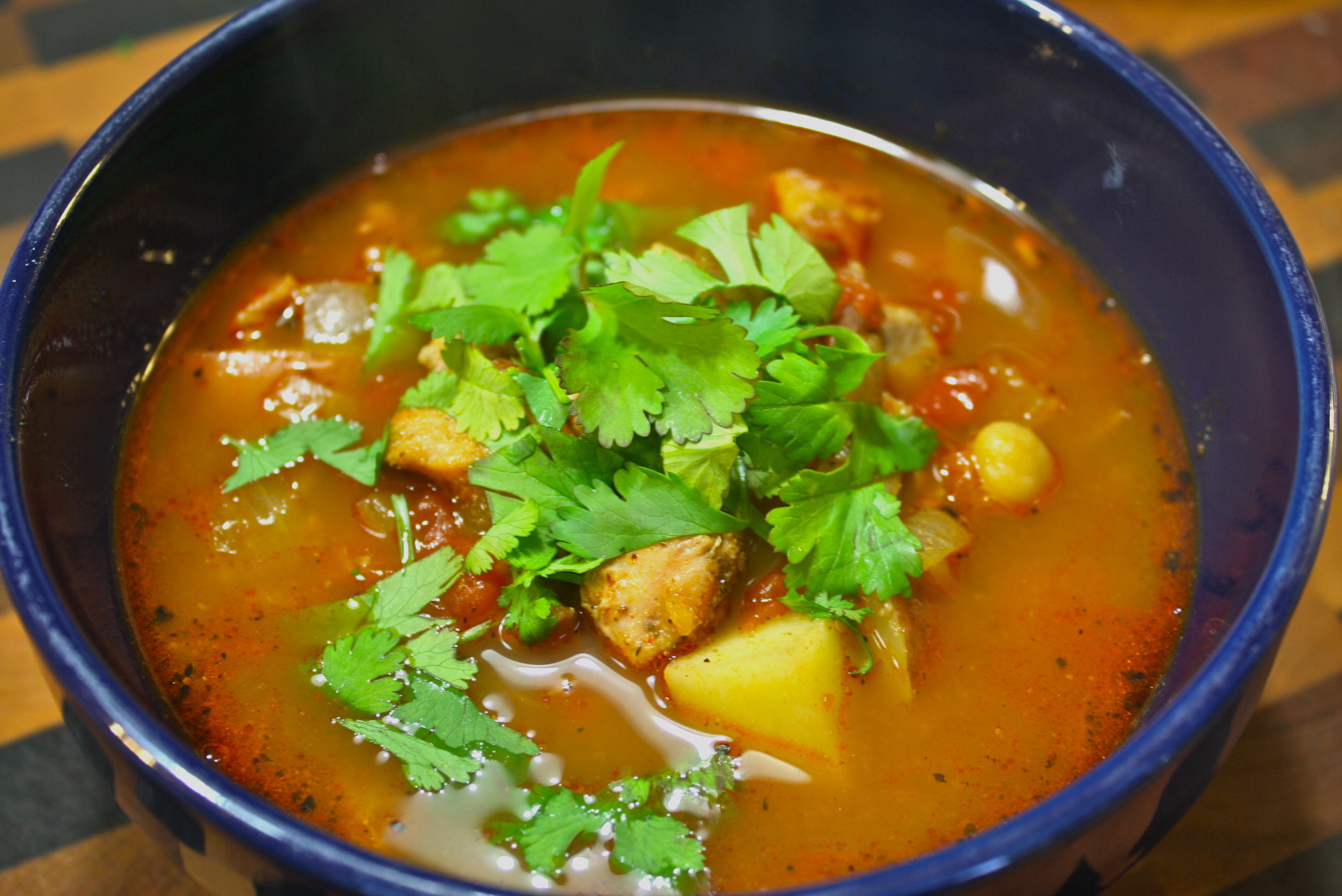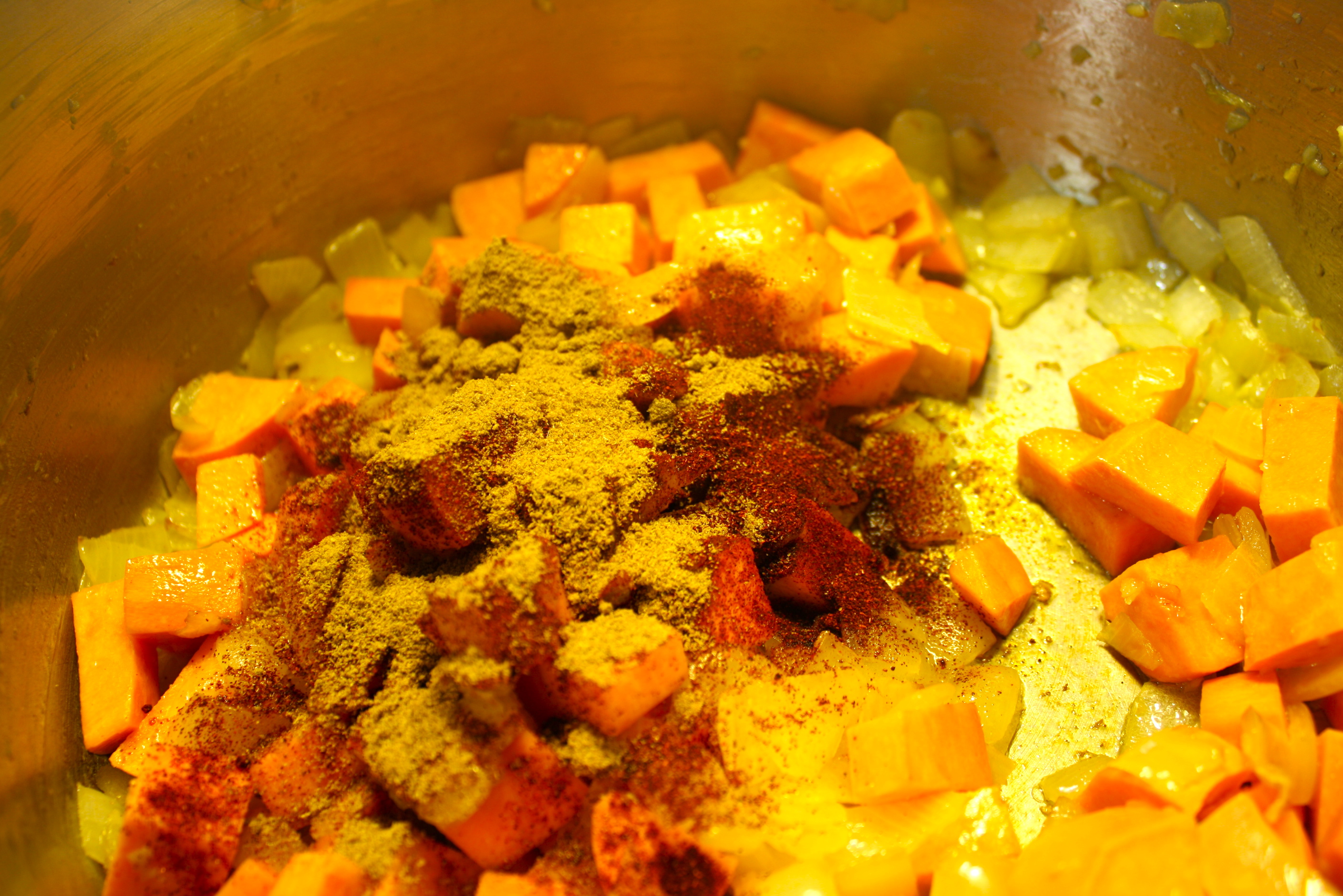 In large soup pot, melt butter and add olive oil. With medium heat, add and saute the onions. (Don’t rush this part) until they begin to turn to a light brown (should take about 10 minutes). Add the garlic and continue for 3-5 minutes longer. Now add the potatoes and let them begin to saute. You can now add the paprika, cumin, and coriander and mix well. Continue saute for 1-2 minutes more, stirring constantly.