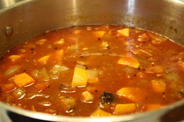 Add chicken broth, chick peas, tomatoes, tomatillos or salsa, and grilled chicken (you don’t even have to remember to thaw it first) and salt. Simmer this for about 1/2 hour (or less) until spud/squash is tender.
