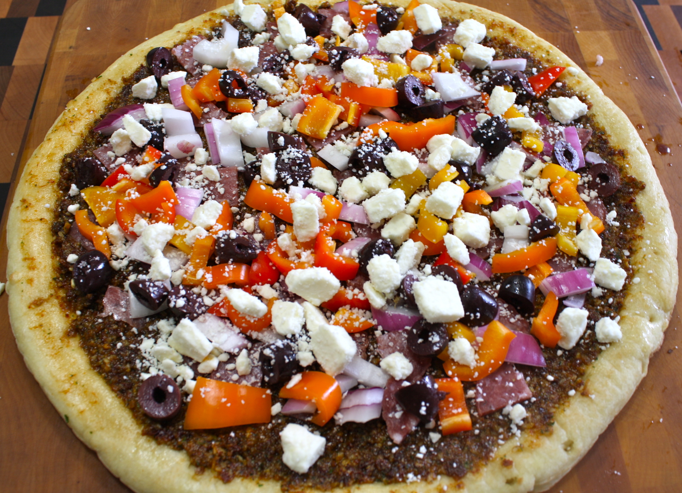 Chop up, onions, peppers, and olives. Thinly slice the salami. Spread a thin layer of olive oil on pizza crusts before spreading pesto. Spread a thin layer of pesto over the pizza crusts. Sprinkle salami, peppers, onion and olives evenly over the pesto. Top with crumbled feta.