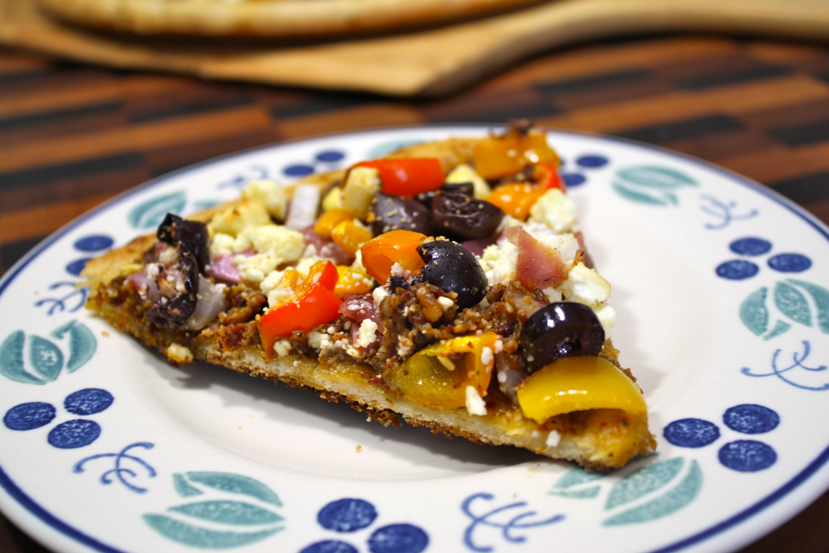 I have plenty of cilantro and sun-dried tomatoes, so an idea was born. A slight twist on your average SD tom pesto, but a very nice twist it turned out to be. Hazel nuts (filberts), balsamic vinegar, and asiago cheese with garlic and olive oil fill out the flavors for the pesto. Topped with red onion, sweet peppers, kalamata olives, an artisan salami, and crumbled feta. He took one bite and I knew I had scored!