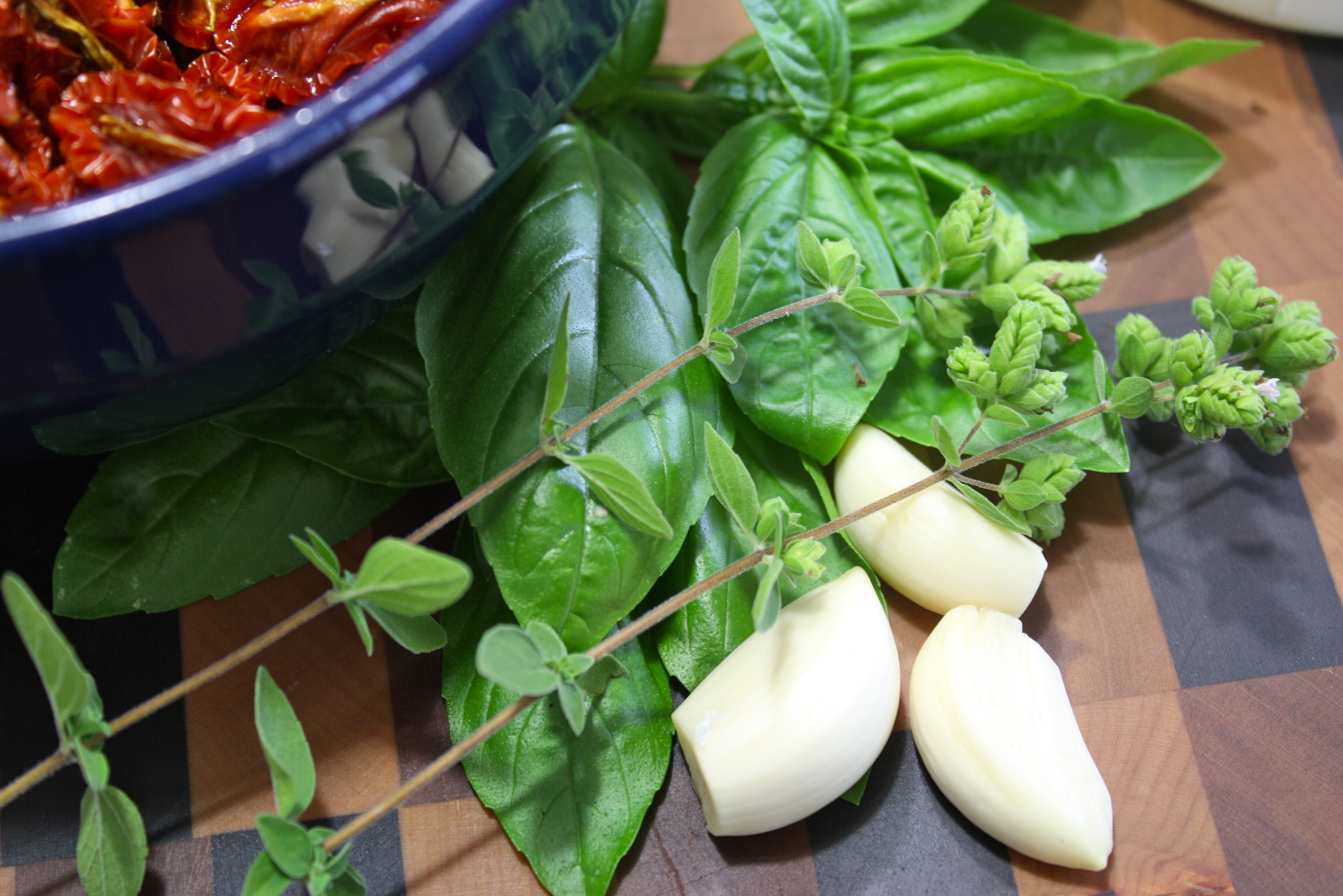 Fresh garlic cloves and fresh herbs of your choice