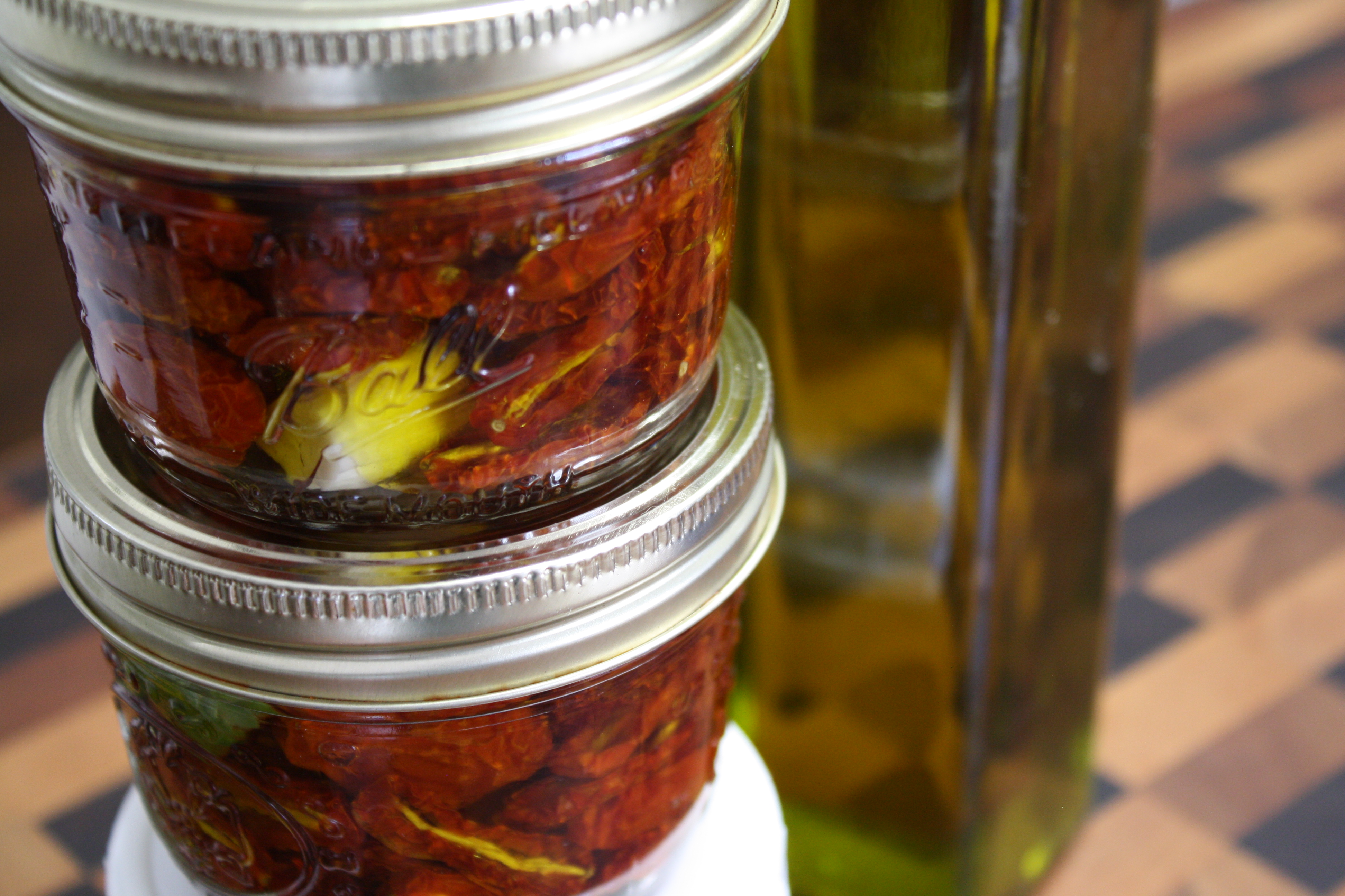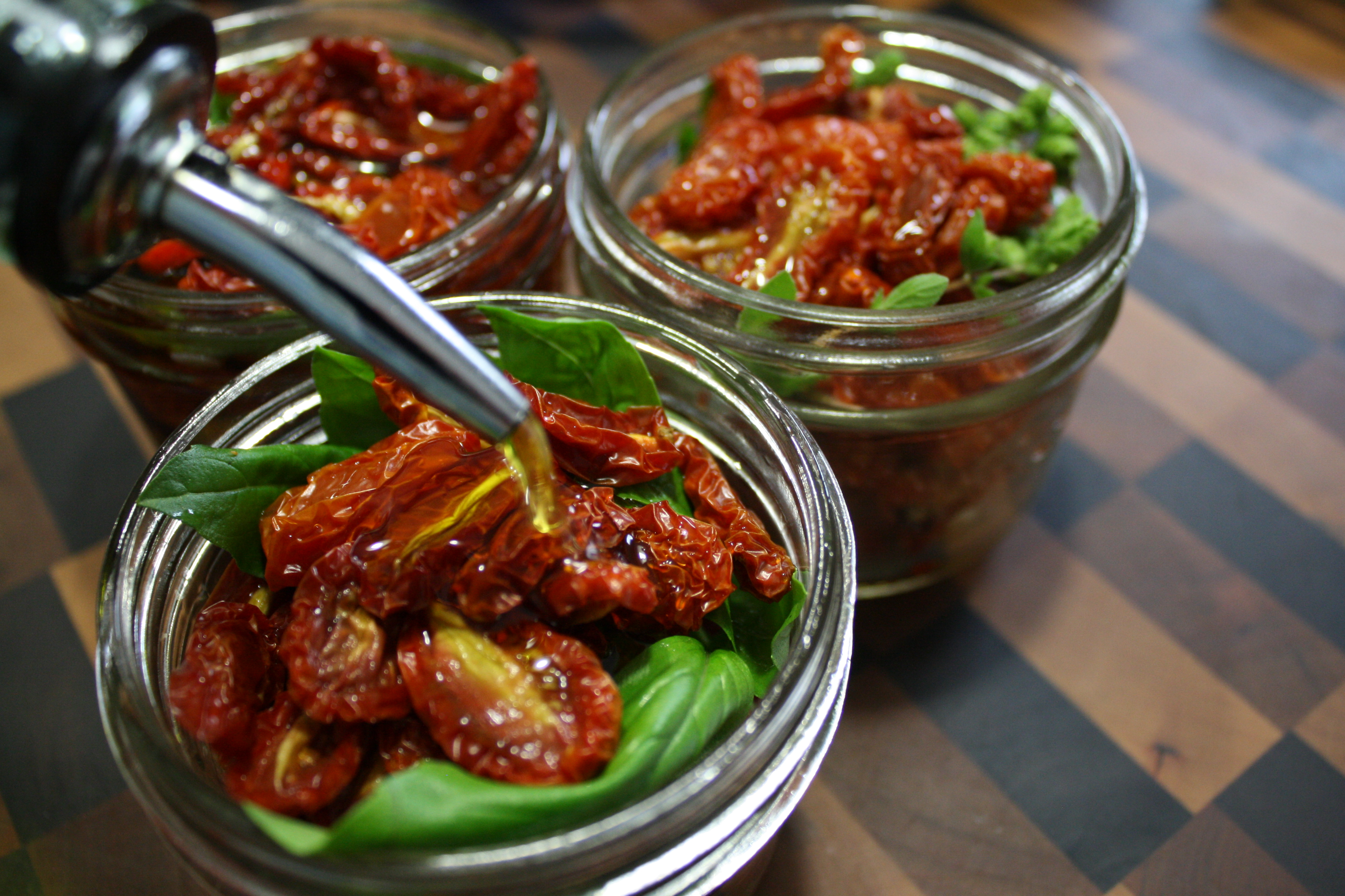 Remove the toms and let them cool. Dip each tom in white vinegar and shake off the excess. Place the toms in clean, sterilized canning jars. Don’t pack too tight, leave about a 1 inch head space. Add a clove of peeled garlic and a sprig of fresh herb if you like (basil, oregano, thyme). Pour the olive oil over contents to about 1/2 inch below the top. Cap jars, label and set aside for about 2 hours. After that you can put them in the back of your refrigerator and forget about them for at least a couple of months.