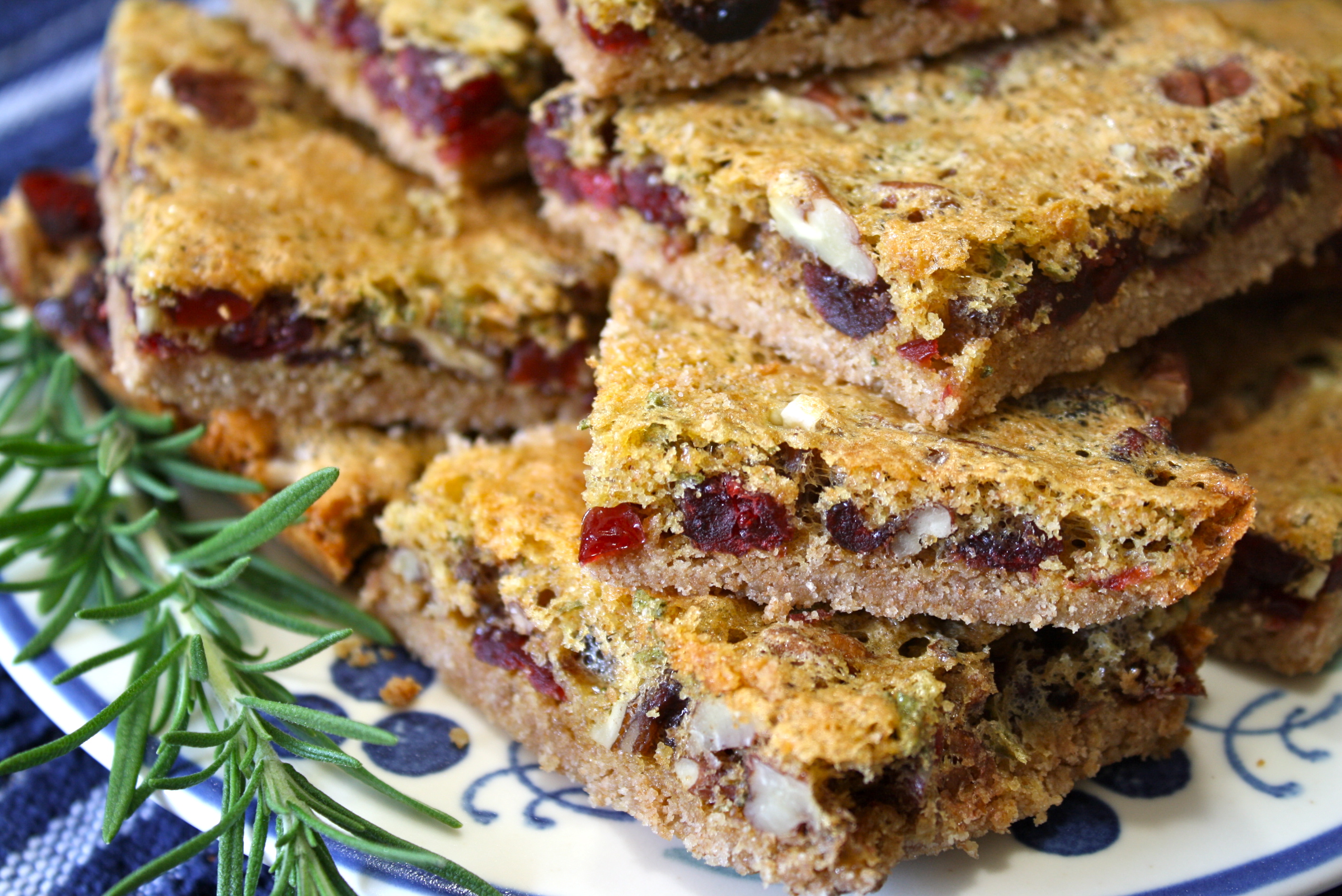 Today, with fall on my mind, I decided to make a cookie bar with the flavors of tart, dried cranberries, crunchy pecans and the fabulous fragrance and flavor of rosemary.