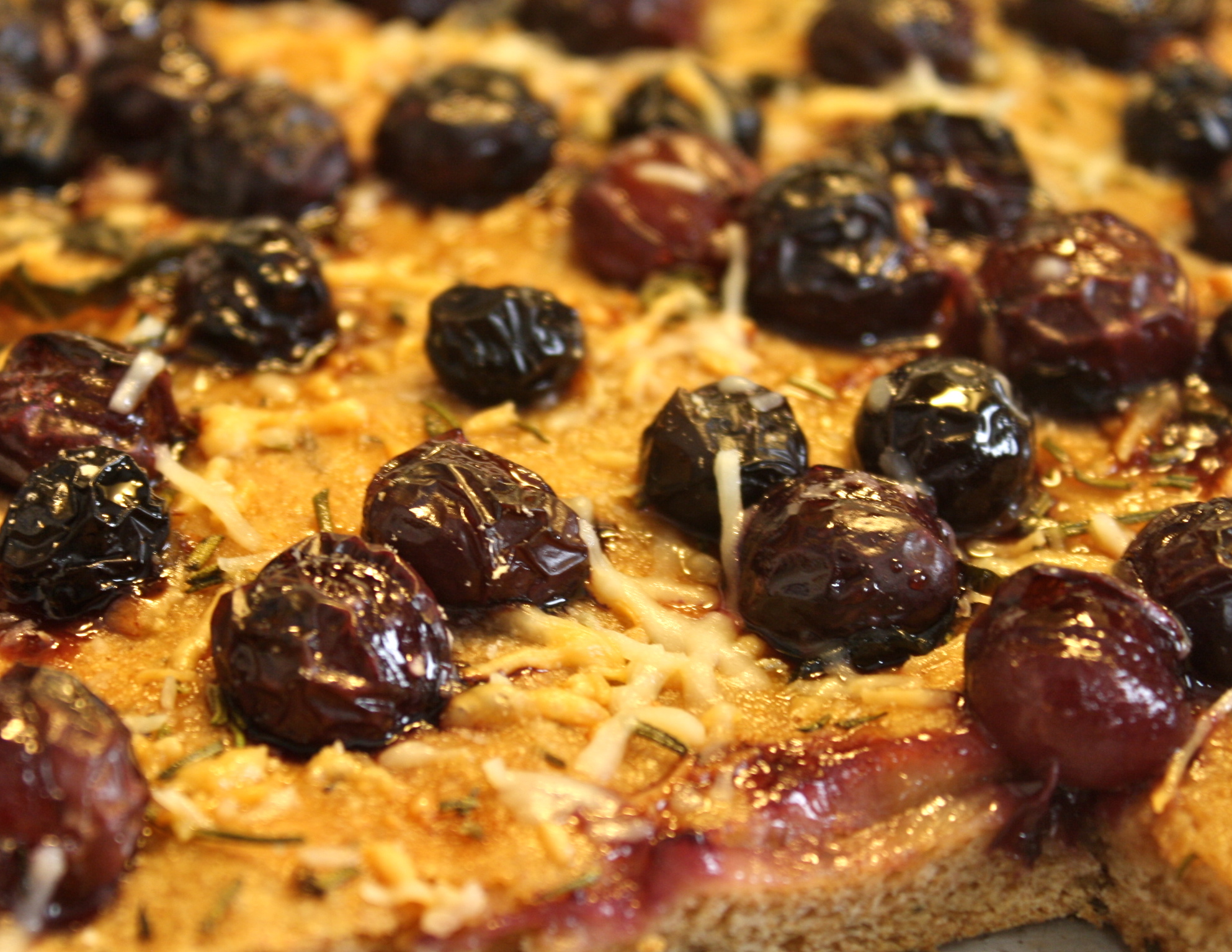 My favorite grape to use is Thomcord; a cross between Concord and Thompson seedless (used for raisins). You get the big flavor of a concord in a smaller seedless grape. They roast beautifully with a mellow sweet flavor. The fresh basil and rosemary with Asiago cheese compliment them well and taste fabulous with the grilled steak and fresh green salad.