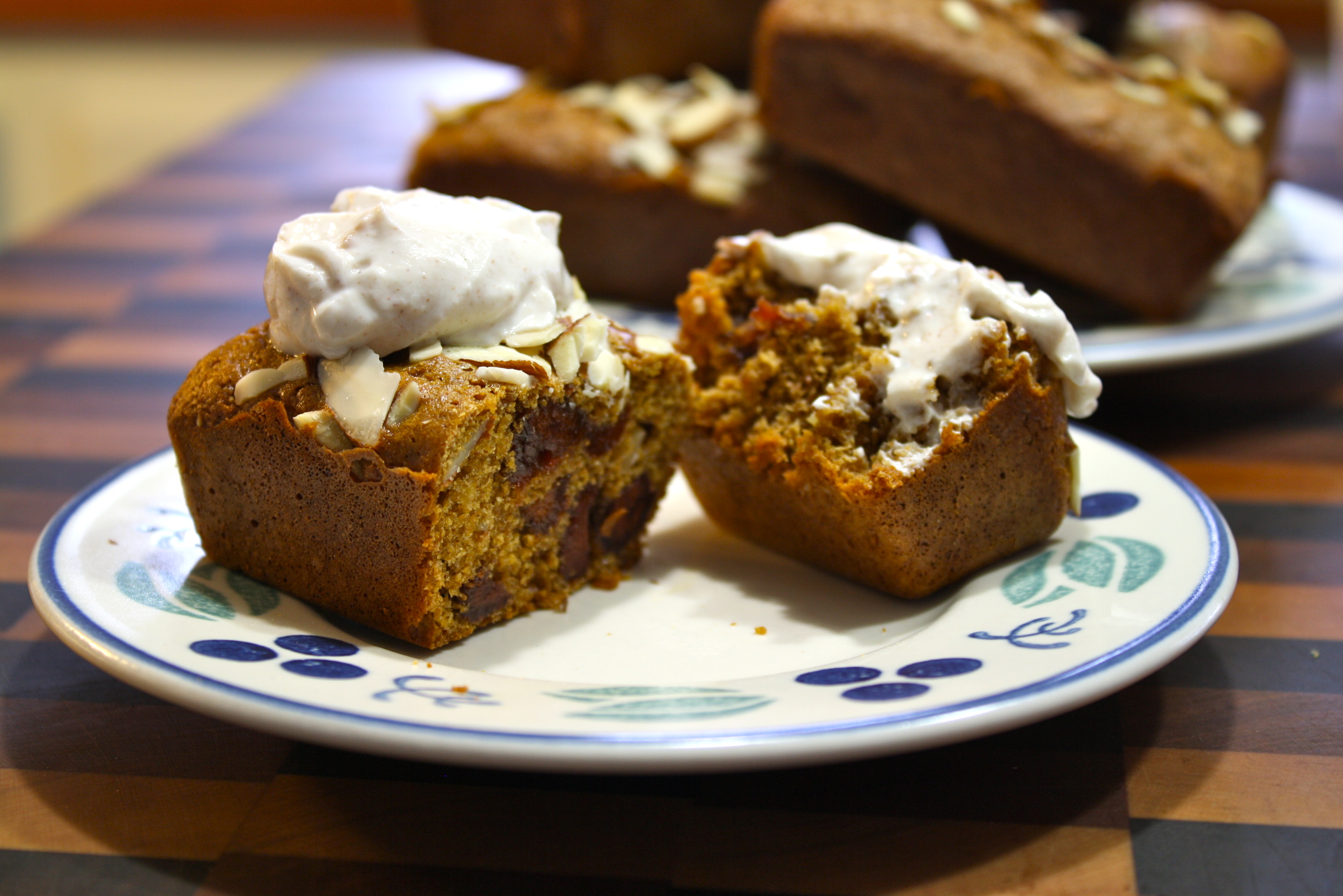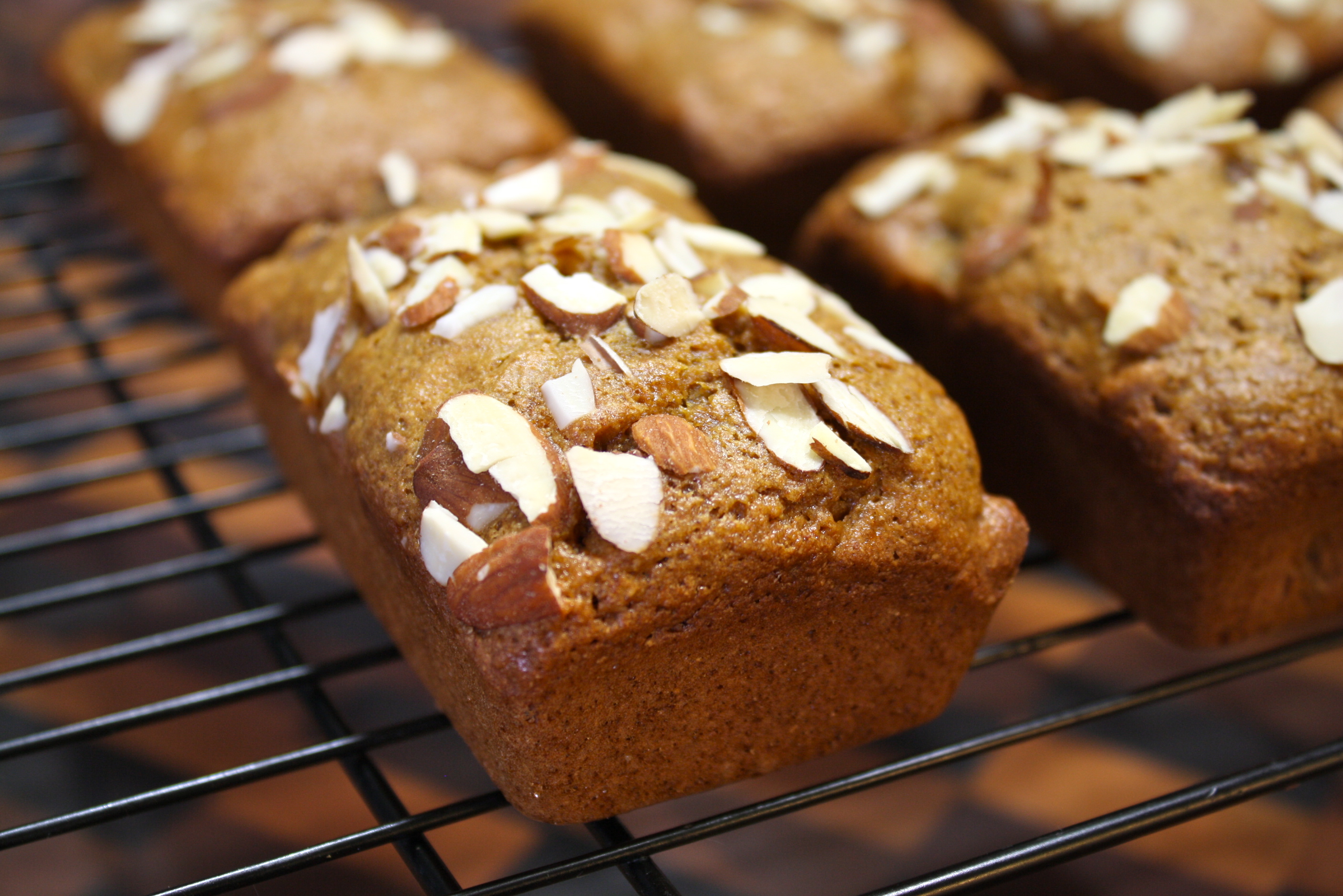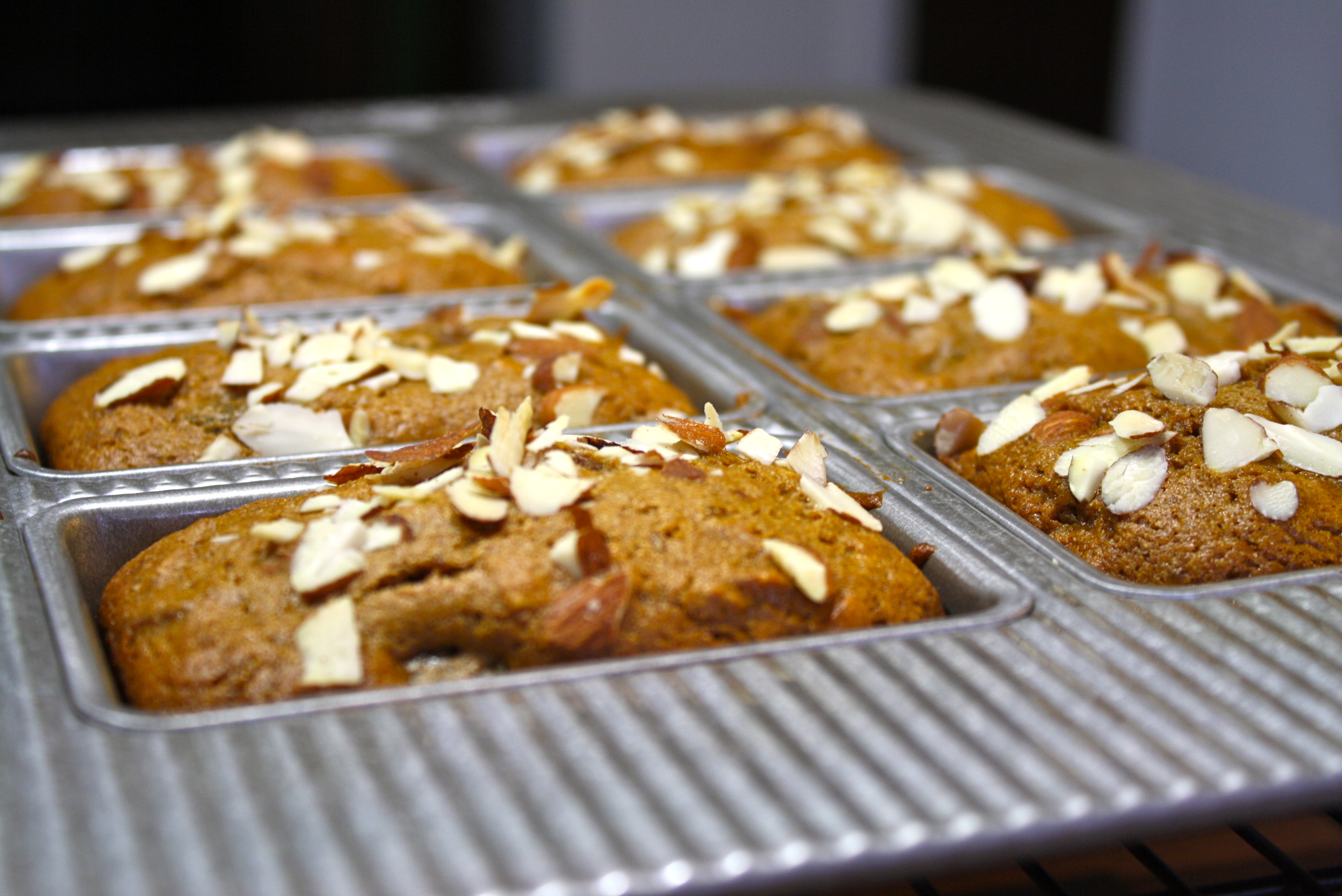 Pour batter into mini loaf pans (or into single 1 lb loaf pan). Sprinkle top with additional almonds. Bake for 30-35 minutes for mini loaves or 45-50 minutes for large loaf. Toothpick inserted in center of loaf should come out clean. Cool for 5 minutes in pan. Remove and allow to cool on racks. Serve warm as is or with a smear of yogurt or soft cheese. Enjoy the aroma and flavor of spring!