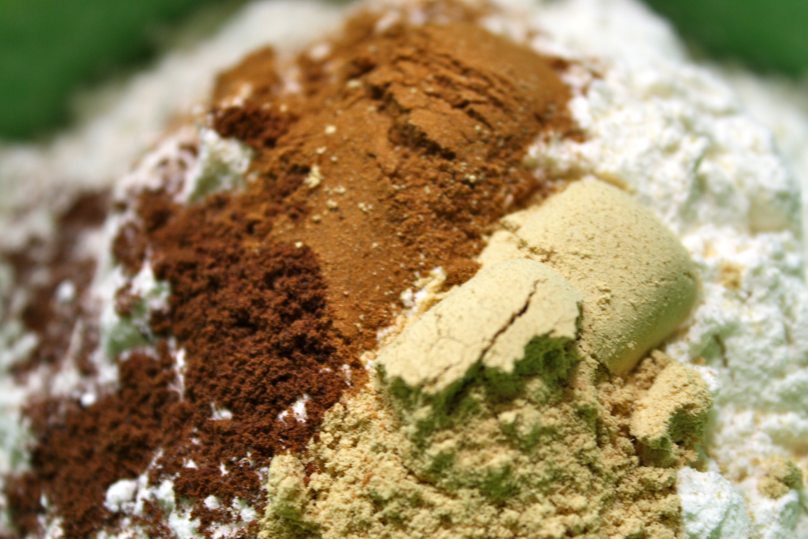 In a medium bowl, mix both flours, spices, baking soda and salt. Set aside.