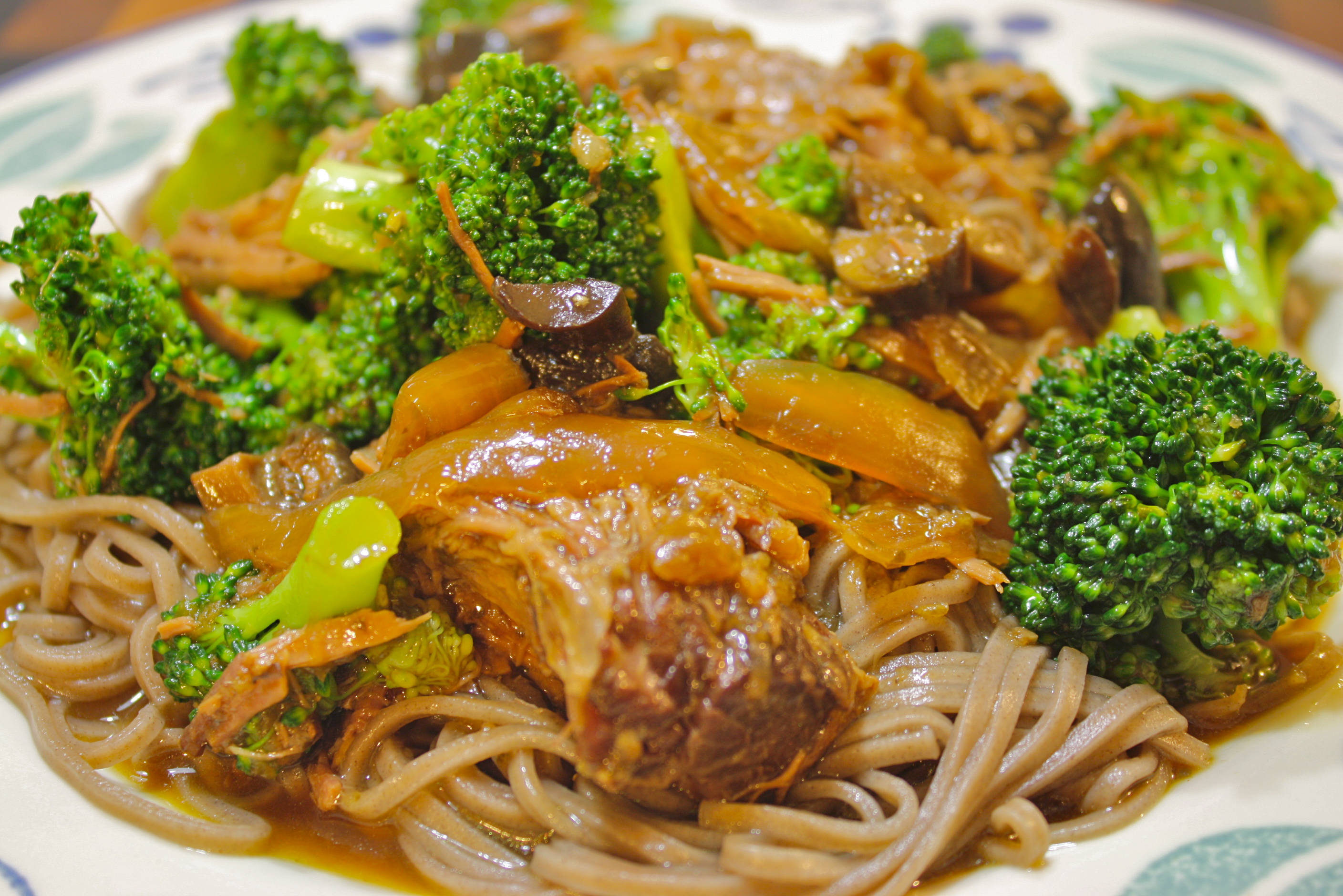 I served this over Soma (buckwheat) noodles. This dish has a lot of flavor and needs a noodle that can hold its own.