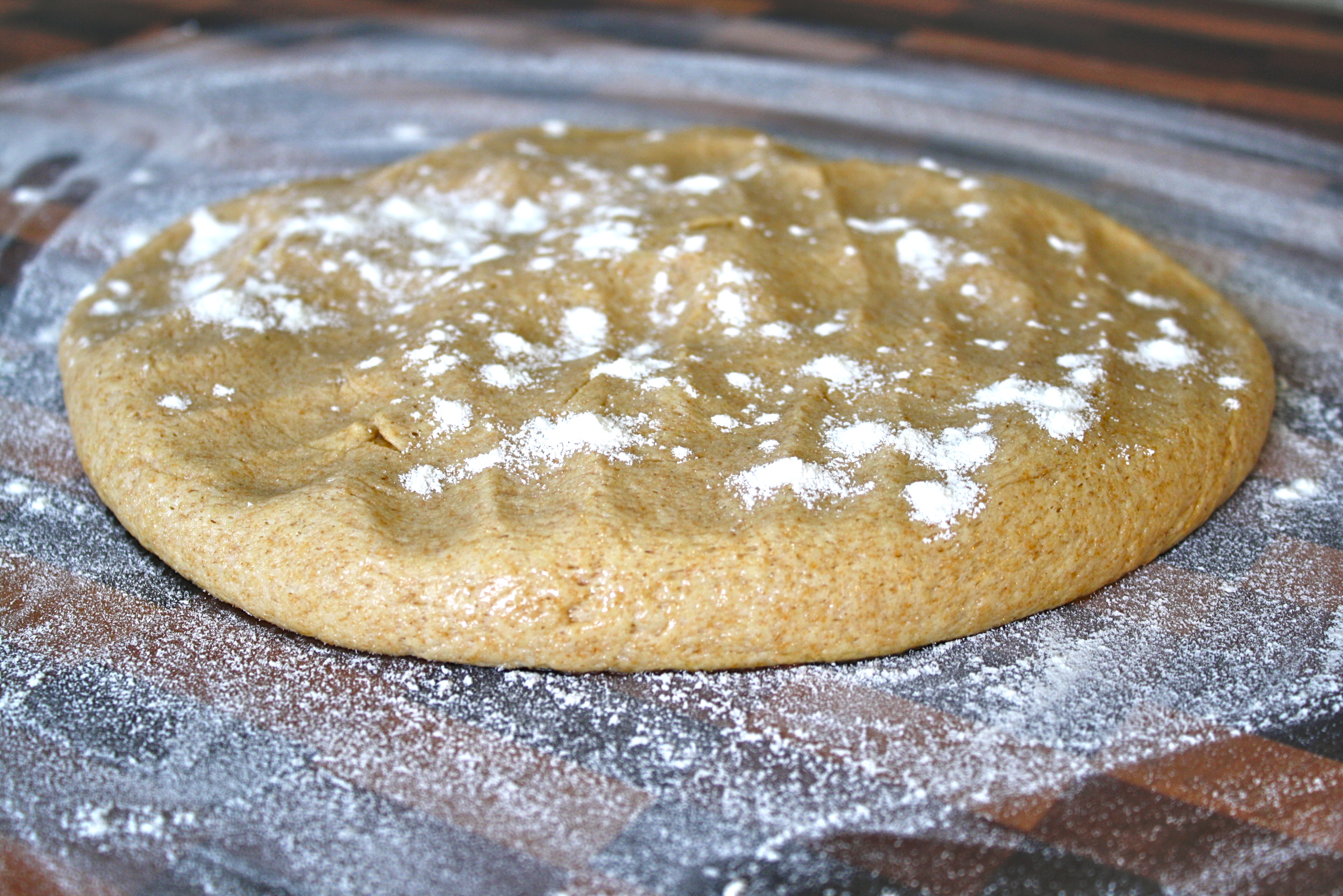 On a lightly floured surface turn out your dough, sprinkle with flour and press down with your fingers.