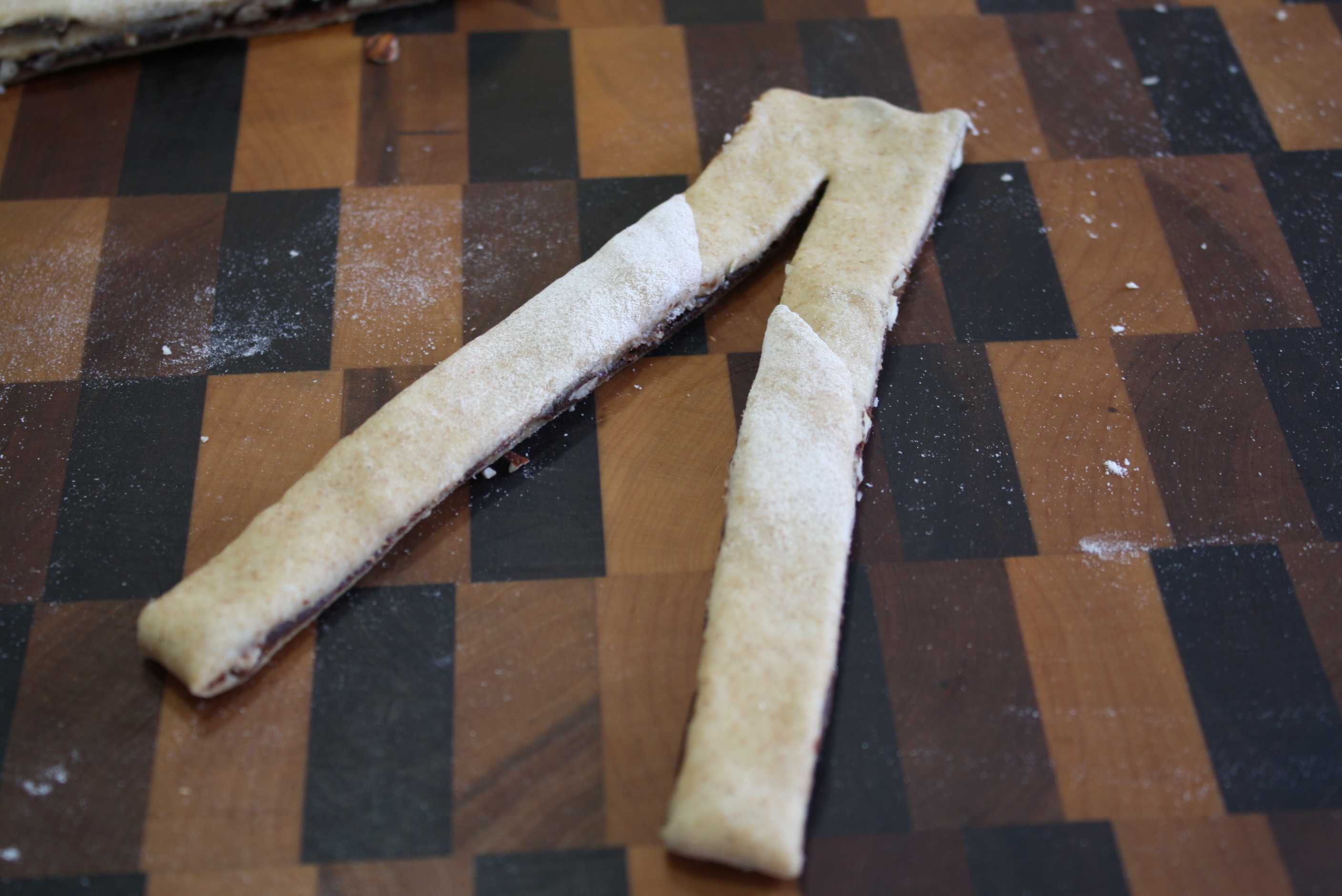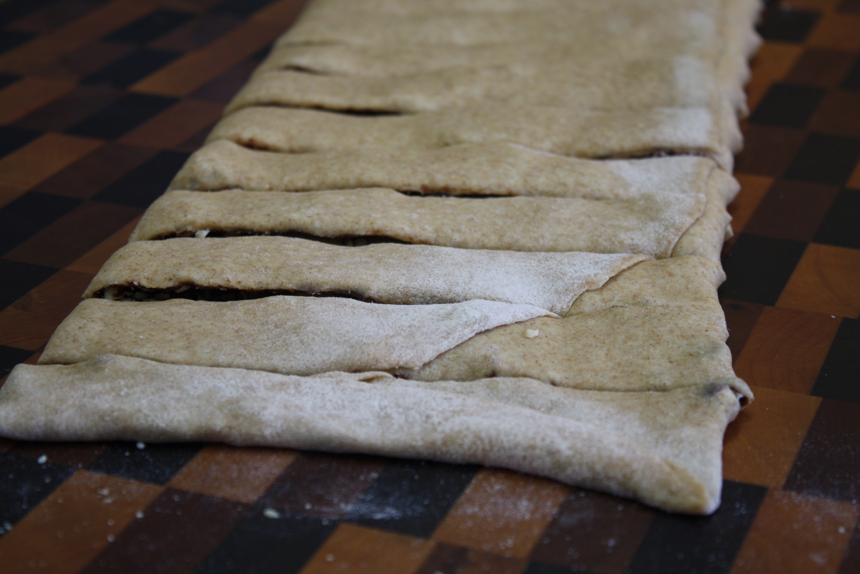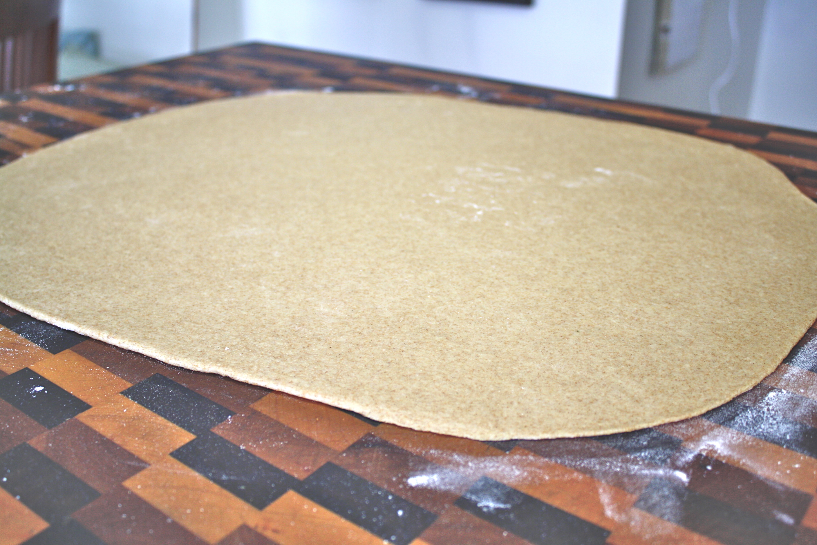 Use a rolling pin and spread dough out into a roughly shaped rectangle about 1/8 inch thick.