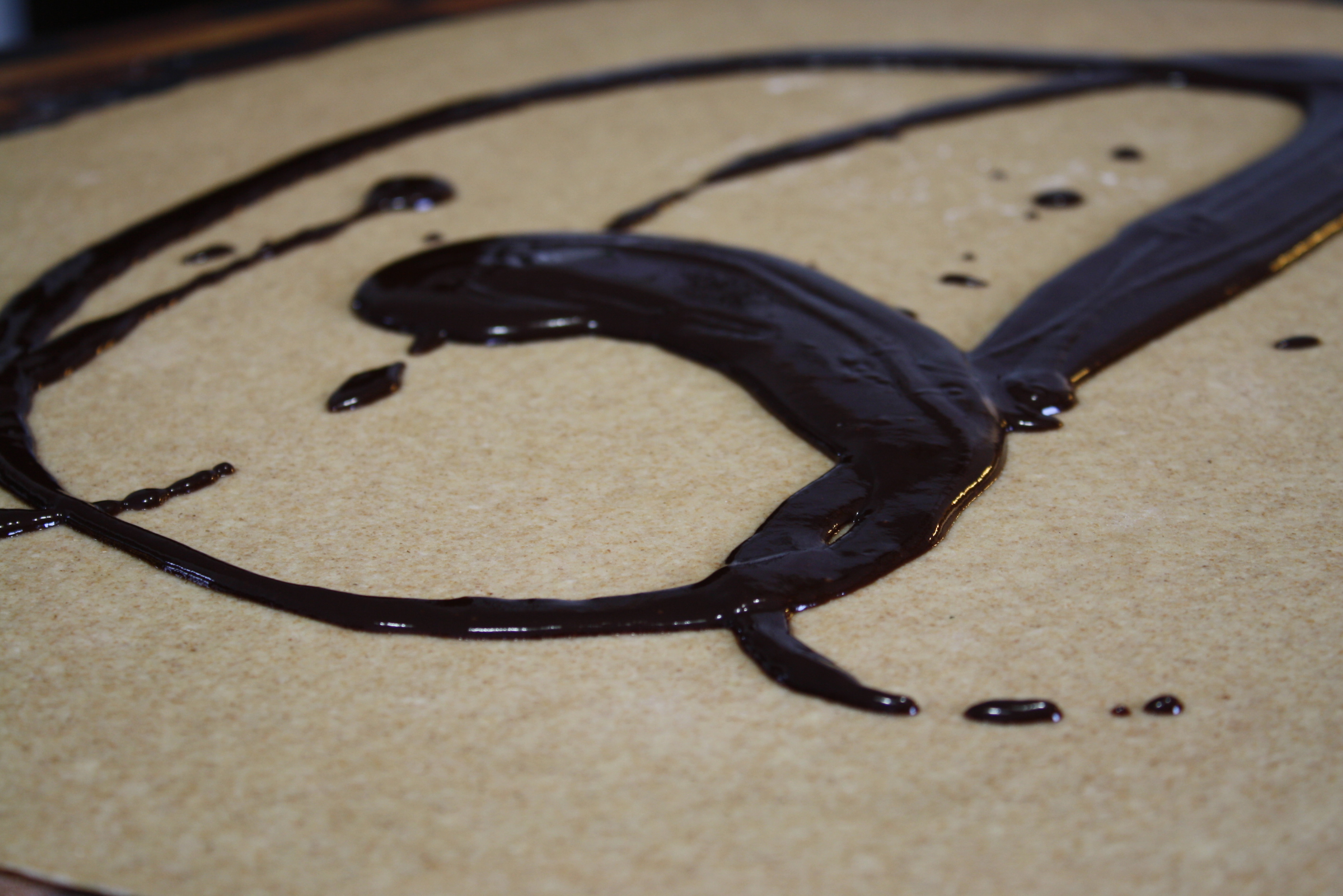Drizzle the sauce over the dough and use a spatula to spread into a thin layer. Sprinkle with chopped hazelnuts.