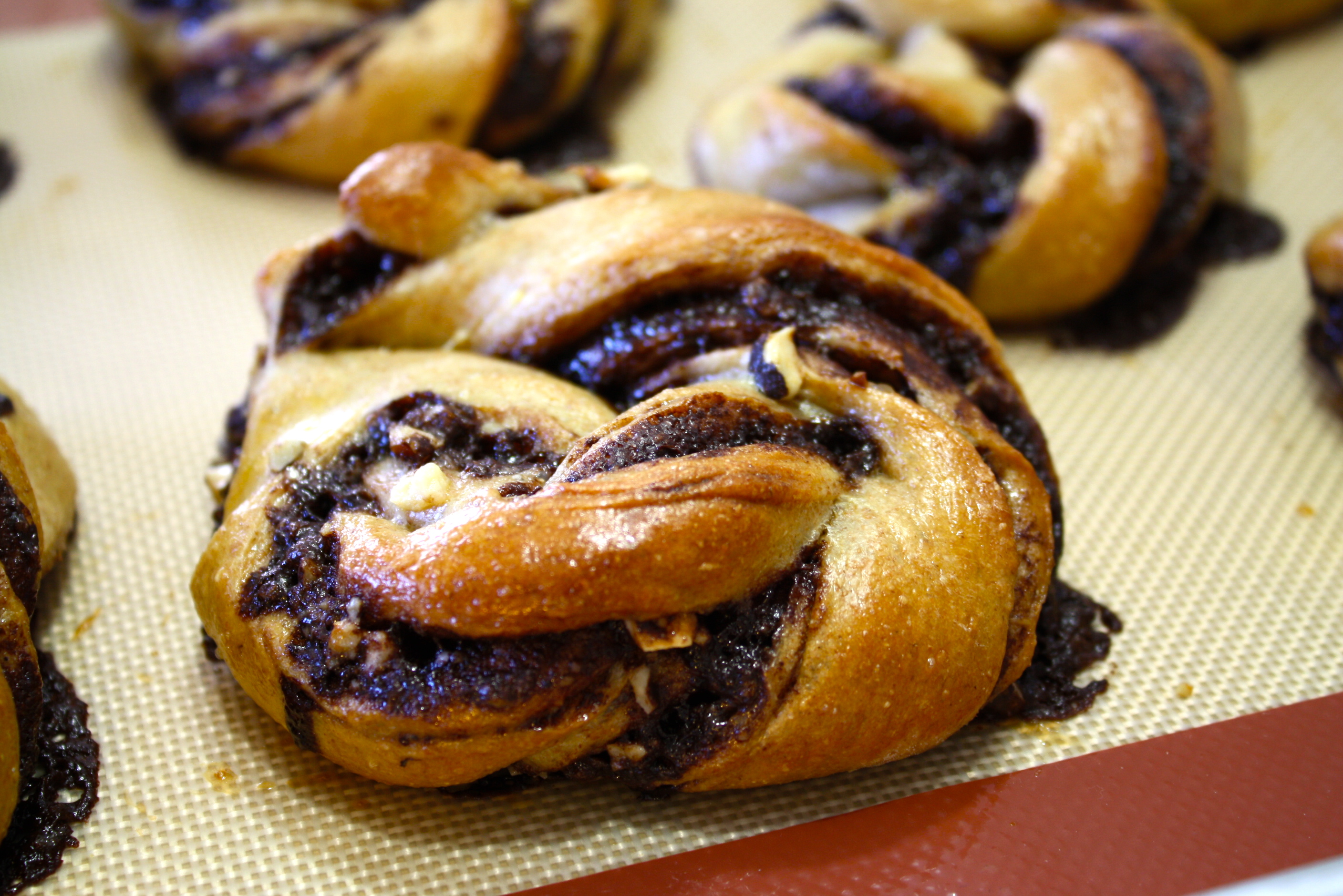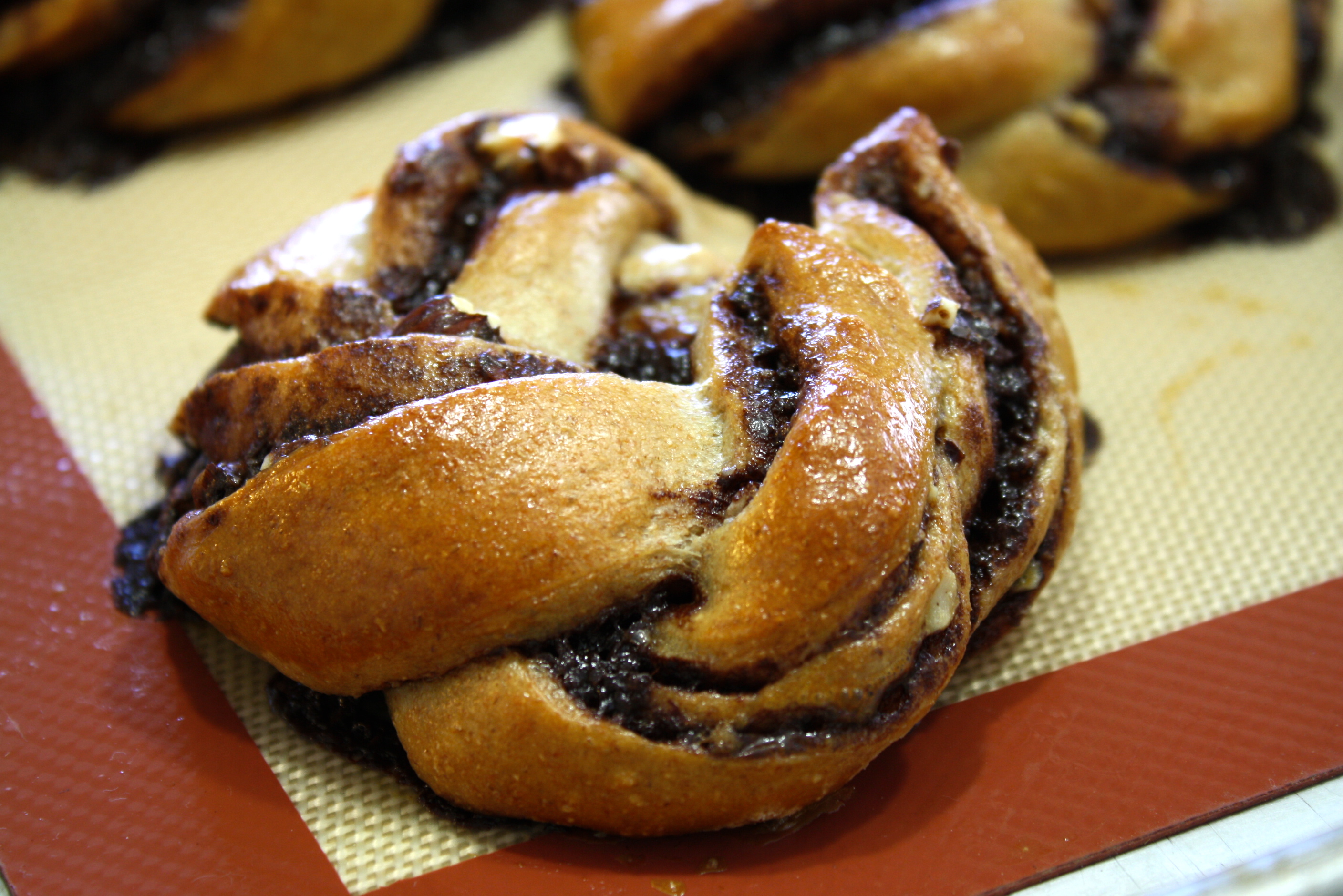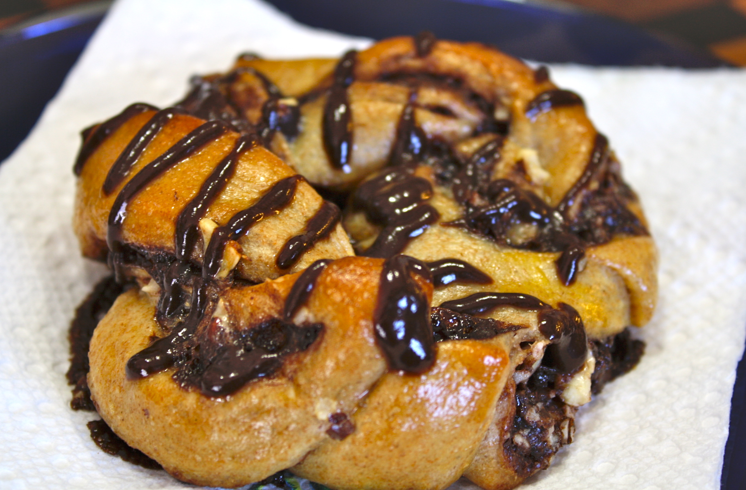 For this dough, I added milk and an egg to improve the flavor and elasticity. The chocolate sauce was simply made from Ghiardelli dark melting wafers and heavy cream with a good dose of cinnamon.