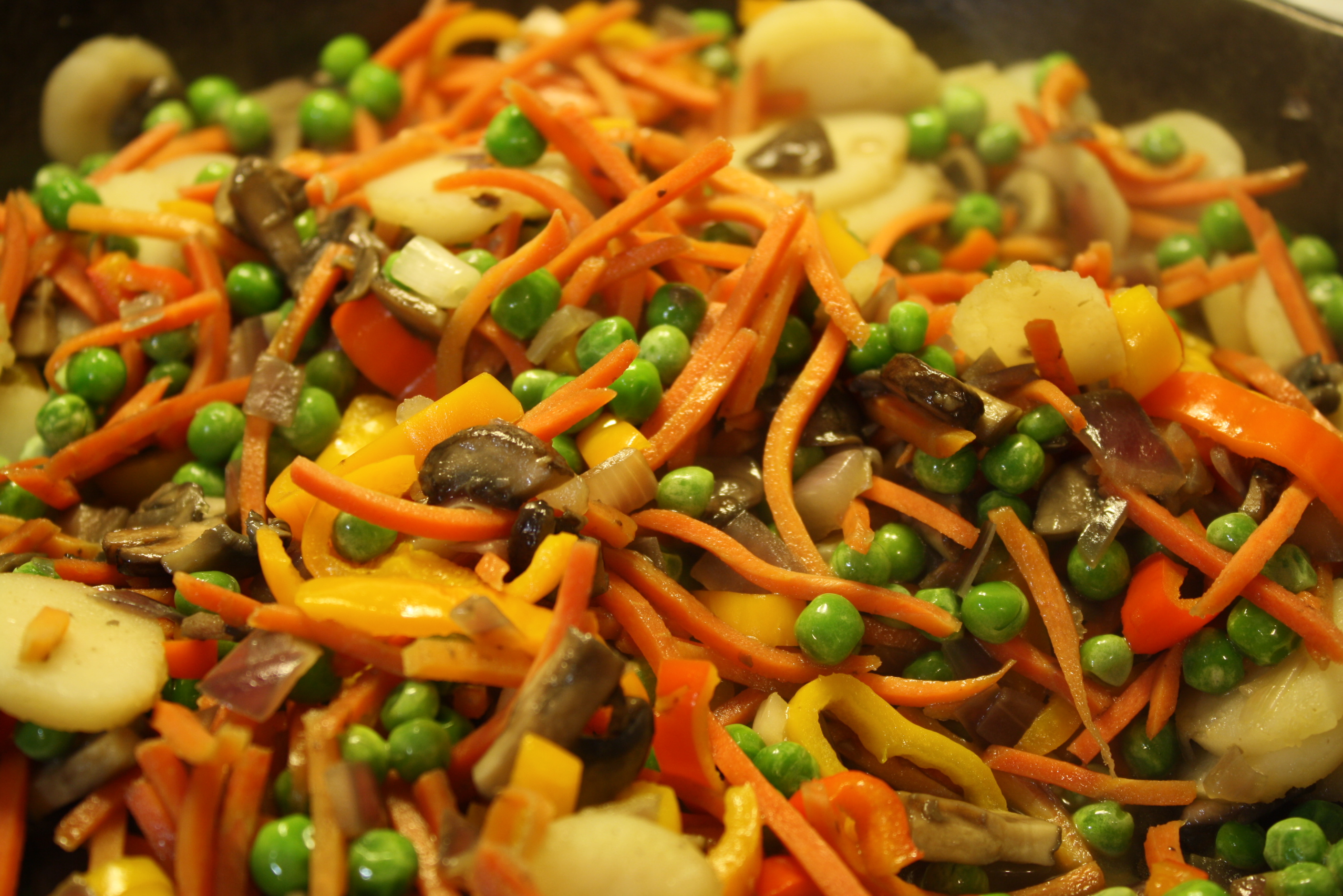 Heat the skillet and then add both oils. Add the sliced mushrooms, carrots, peppers, water chestnuts and snap peas (wait if your using snow peas or frozen peas). Saute until mushrooms begin to yield their liquid, about 3-5 minutes. Add raw seafood or already cooked chicken or pork and cook for 3-5 minutes longer.