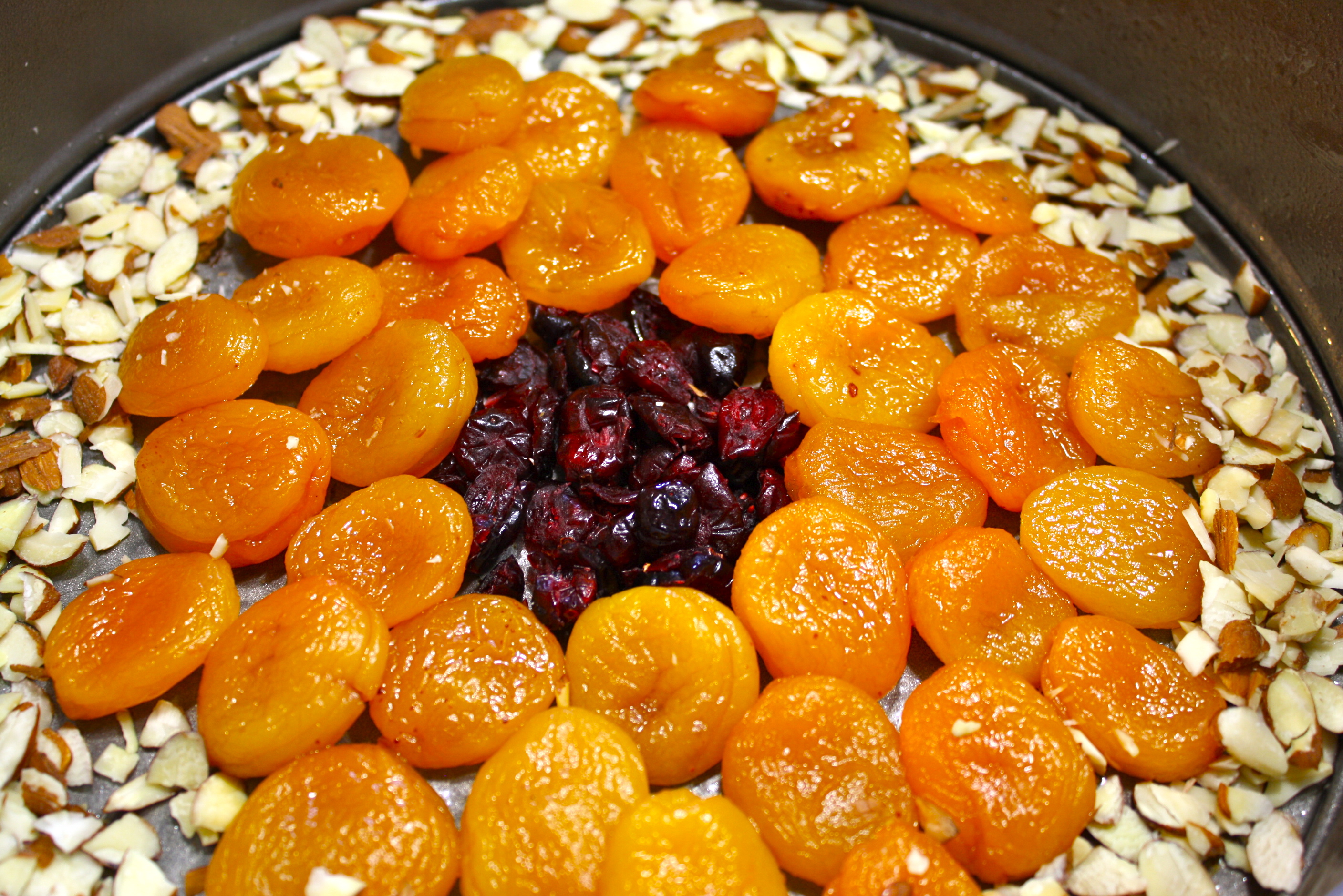In a well greased 9 in pan, place your cranberries in the center. Lay out the apricots in a circular pattern. Sprinkle the outside rim with the almonds. (or make up your own pattern!)